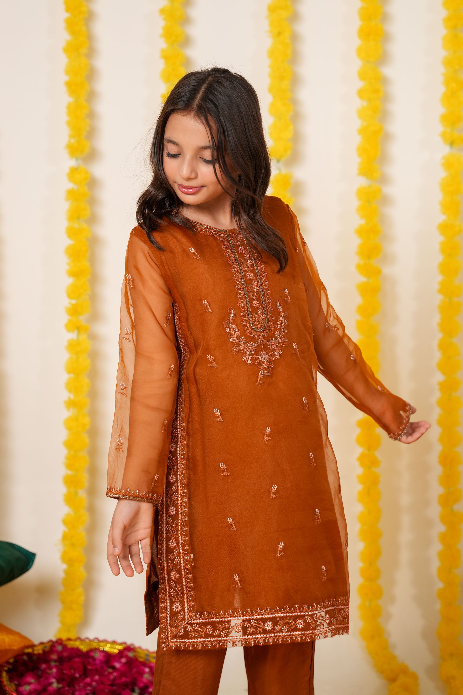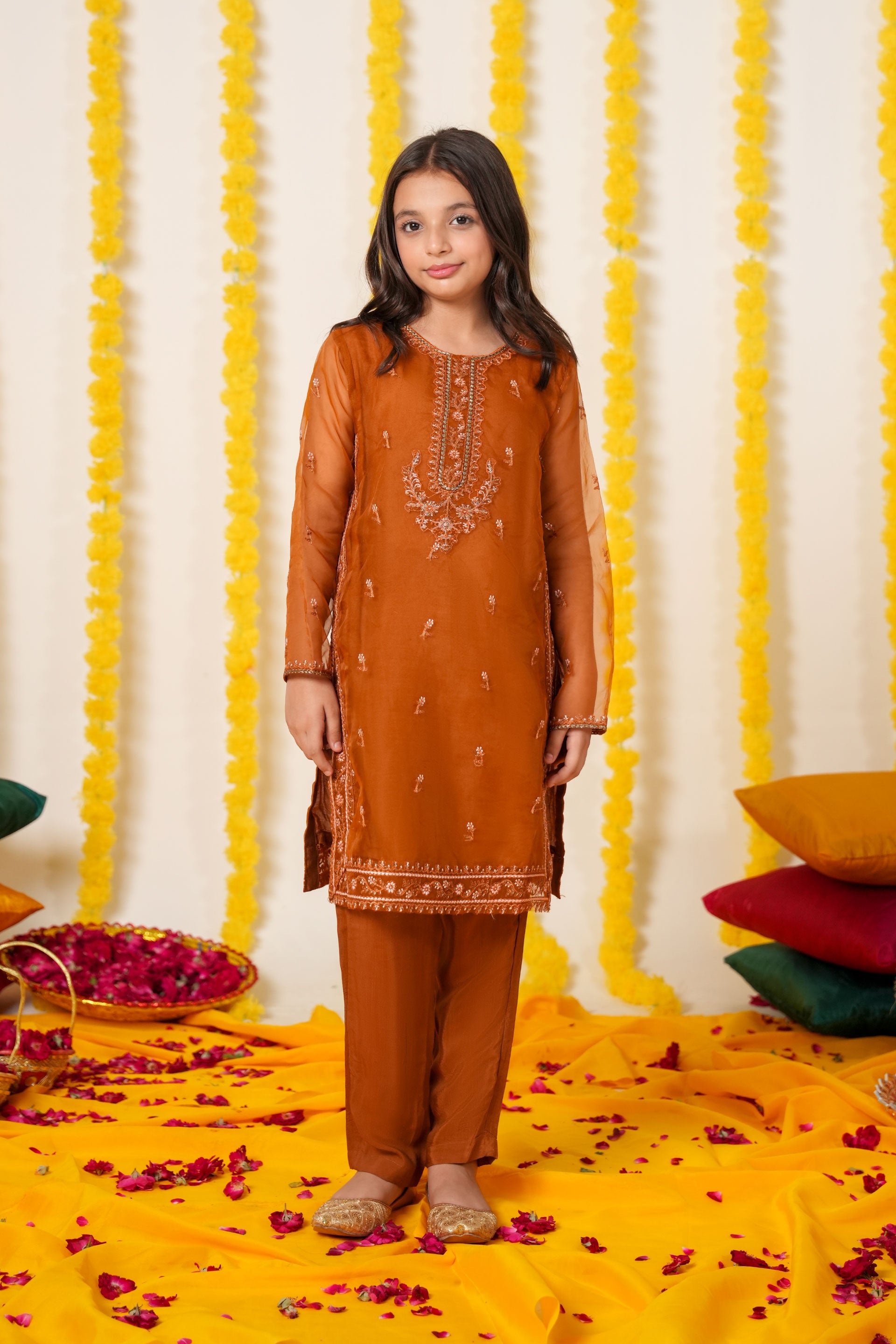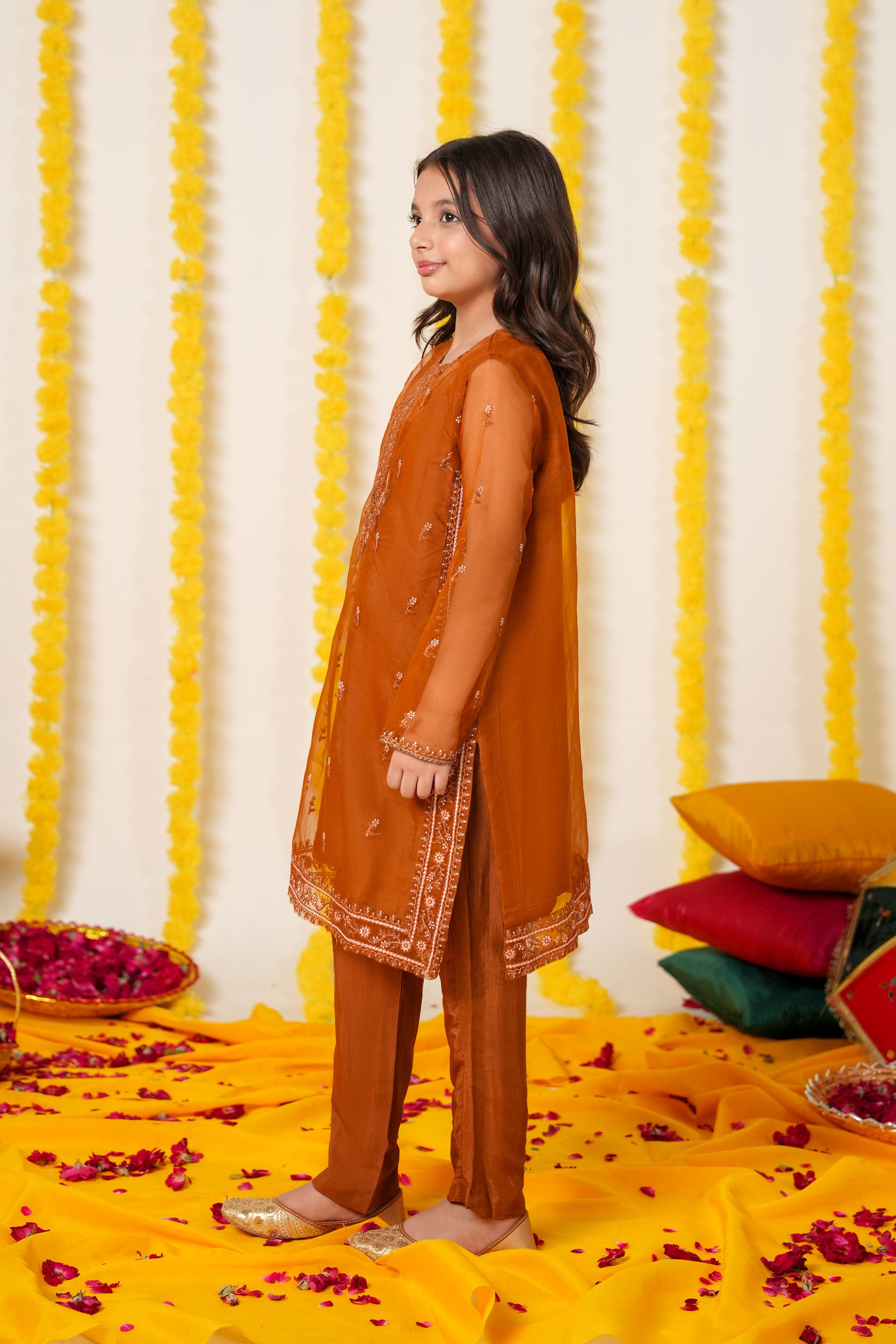 Add a royal touch to your little one’s festive look with our Amber Glow Organza Suit, designed especially for Eid celebrations, weddings, and special occasions. Crafted from premium quality organza fabric, this elegant outfit radiates festive charm with its rich amber hue and intricate embroidery work on the neckline, sleeves, and hem.