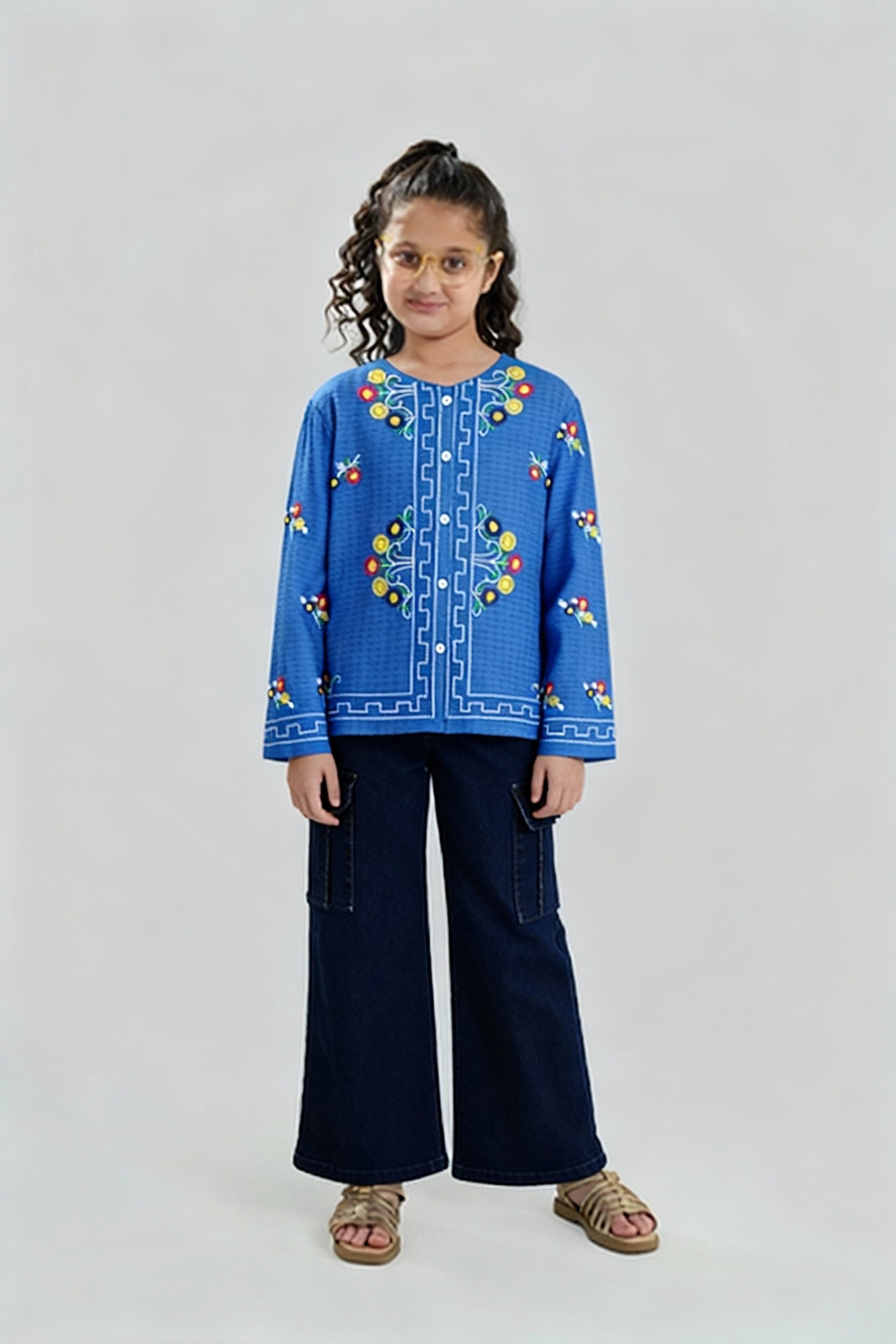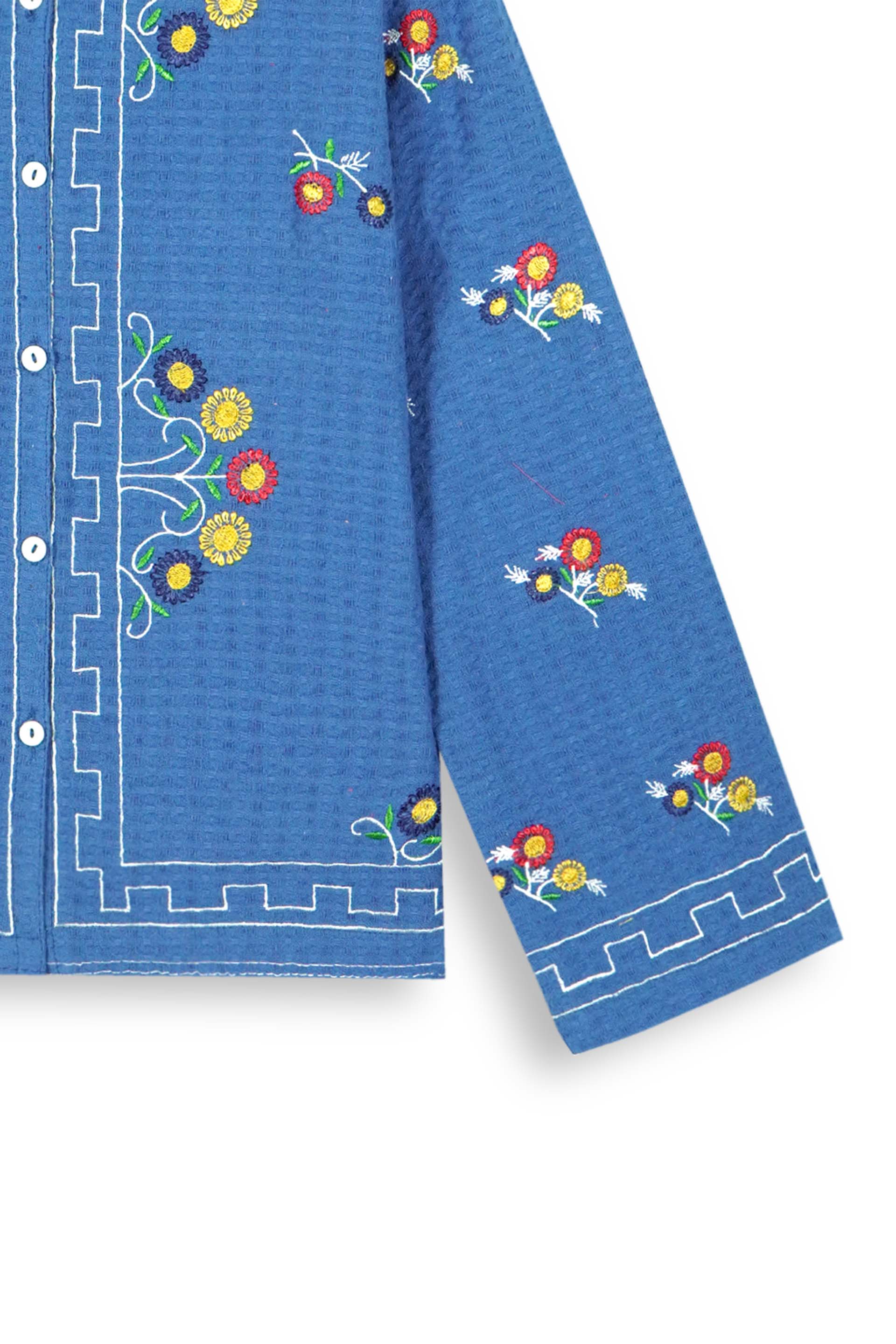 This Blue Jacquard Embroidered Shirt blends classic craftsmanship with modern style. Crafted from premium jacquard fabric, it offers a rich texture and cozy warmth ideal for the winter season. The shirt features intricate floral embroidery on the front, sleeves, and neckline — showcasing fine detailing and vibrant colors.