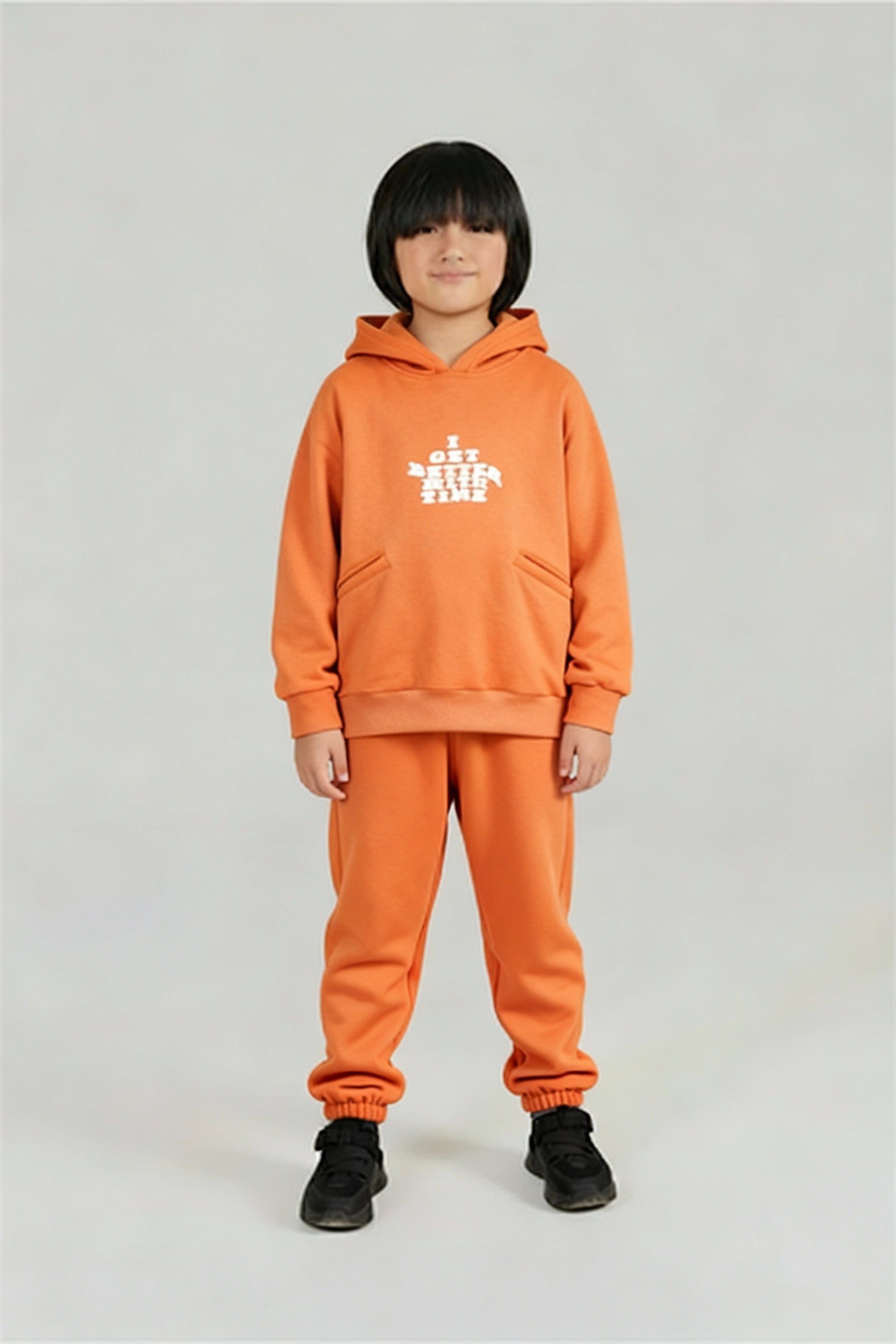 The rich burnt orange color brings a vibrant, modern touch to your child’s wardrobe. Designed with ribbed cuffs, side pockets, and an elastic waistband, this suit ensures a relaxed fit for everyday wear, outdoor fun, or cozy winter days.