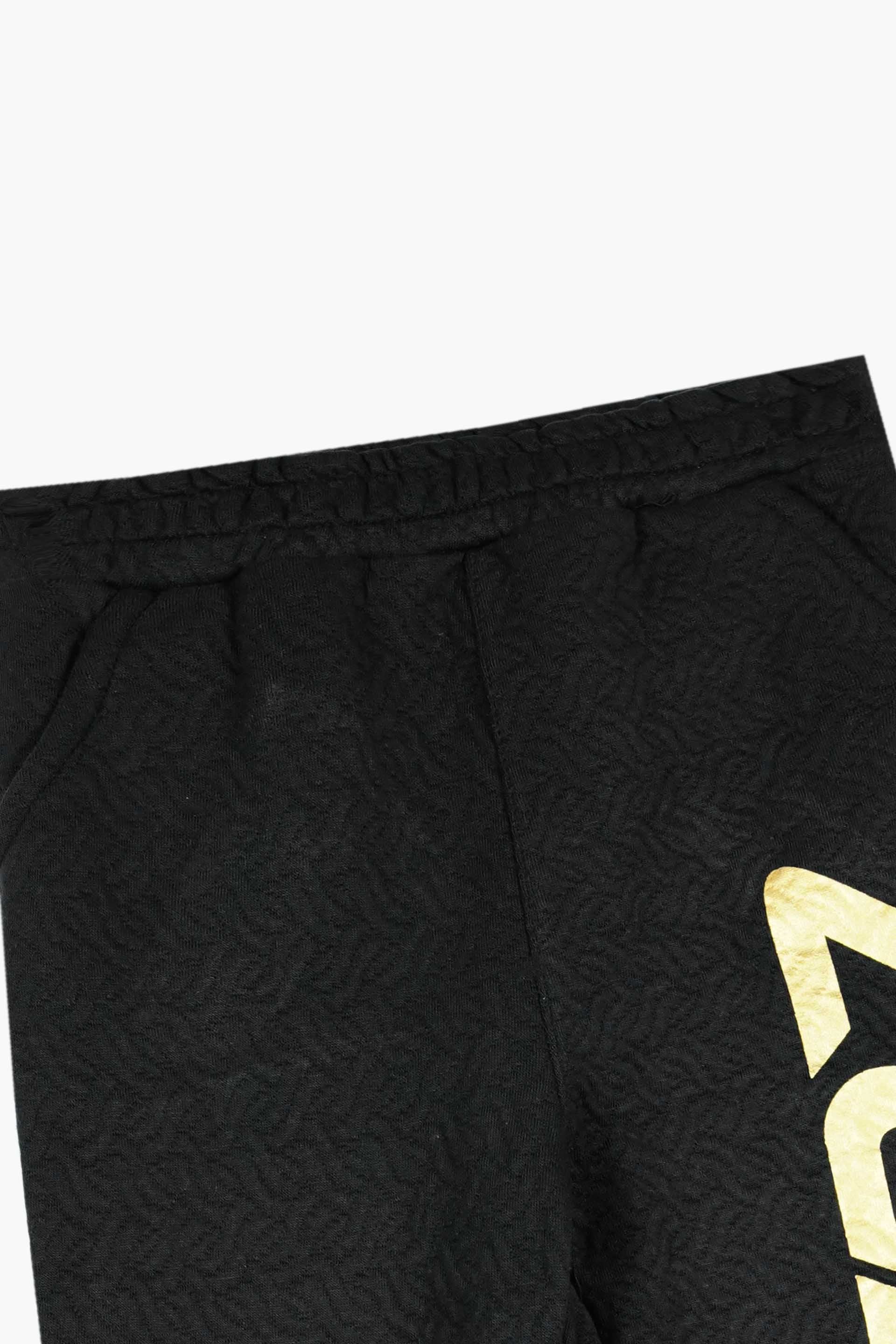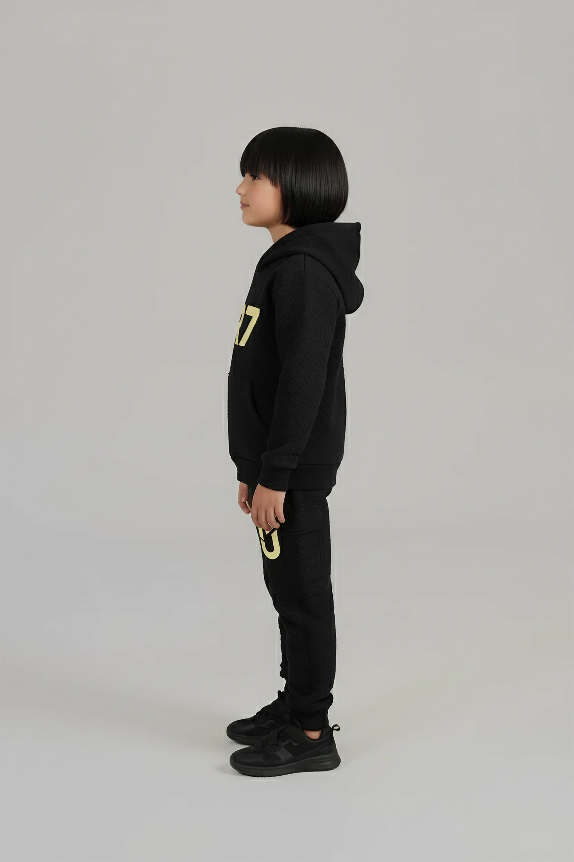 The front features a bold CR7 logo in golden print, while the back showcases Ronaldo’s iconic silhouette with jersey number 7, making it a perfect choice for young football lovers. The set includes a hooded sweatshirt with a kangaroo pocket and matching jogger pants with a CR7 print, combining sporty style with casual comfort.