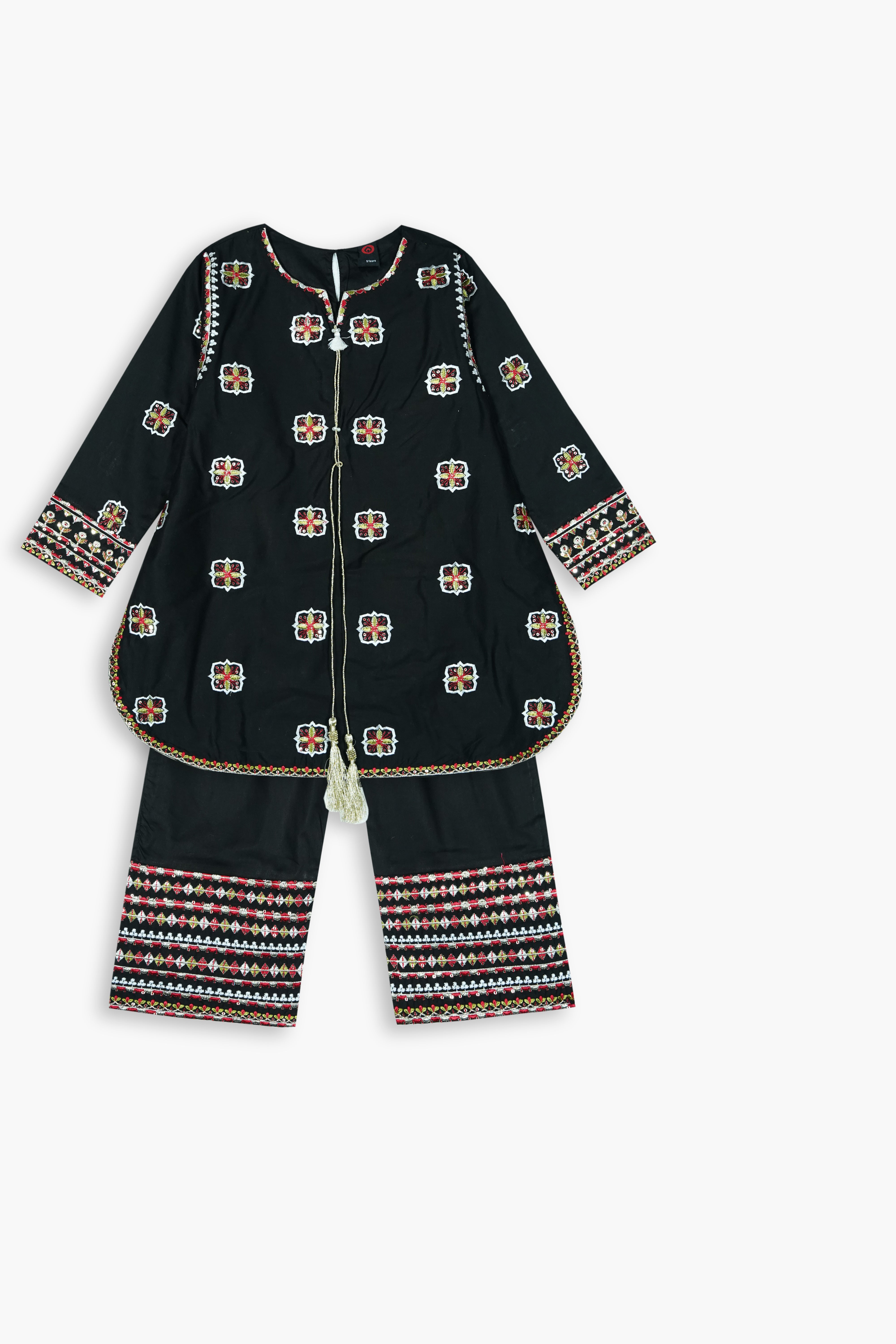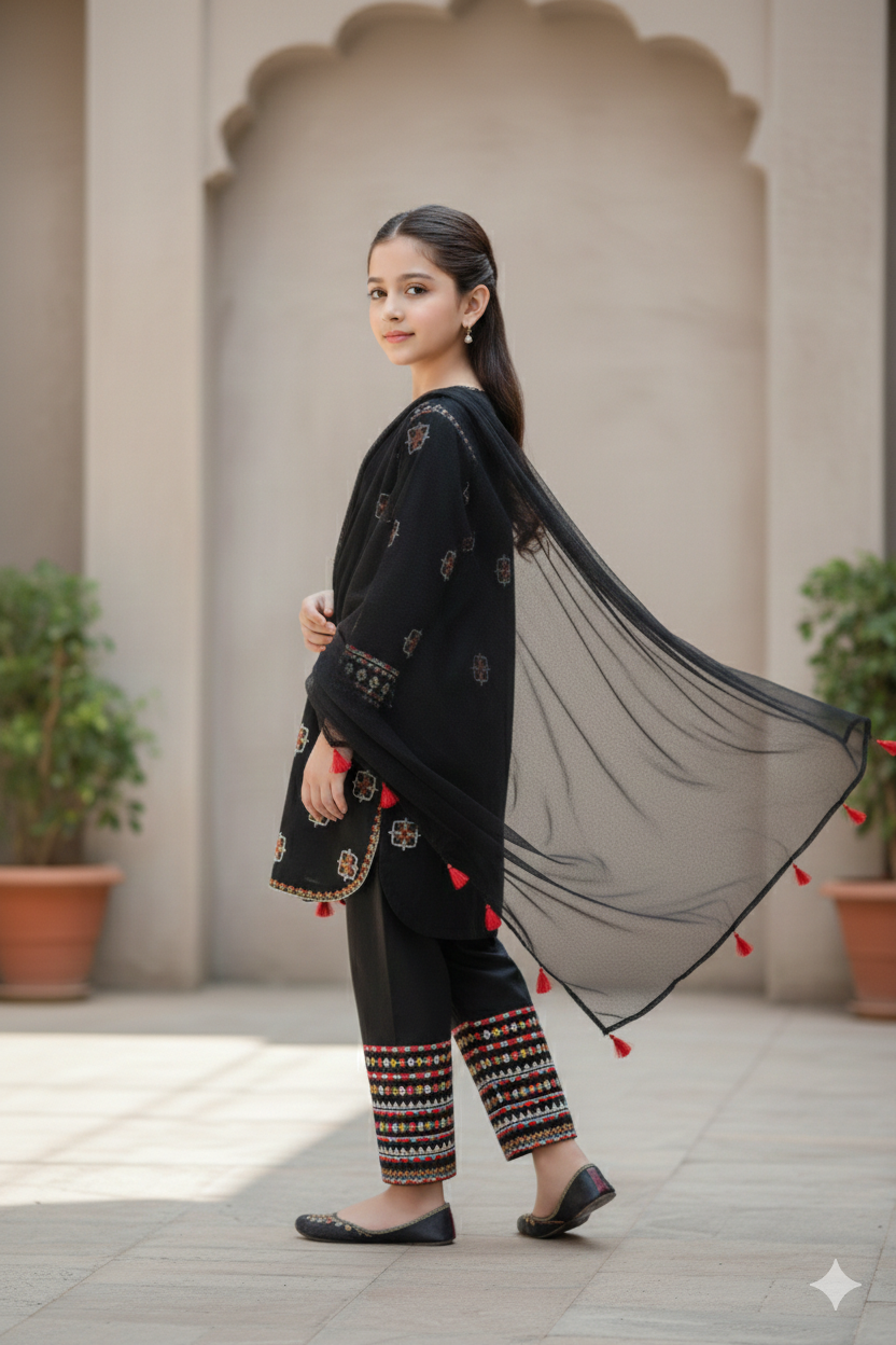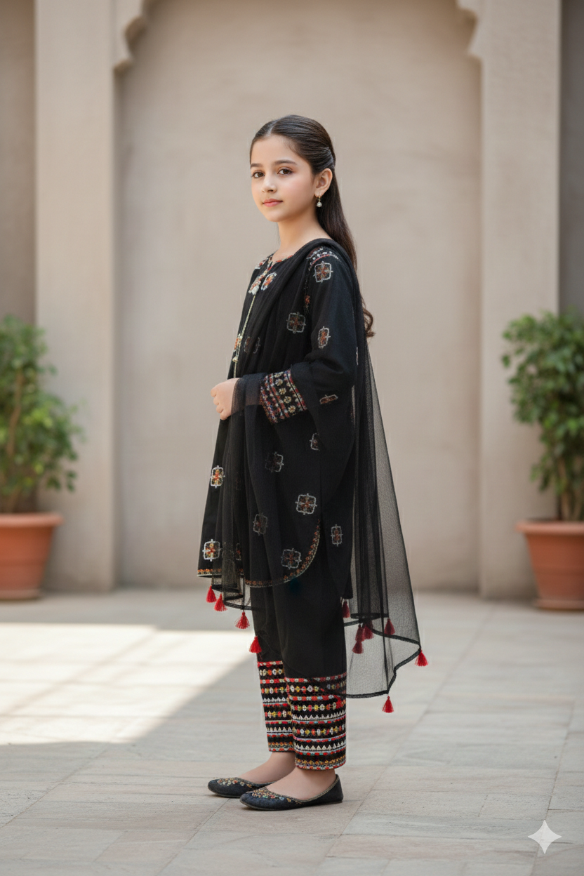 Paired with matching cotton trousers detailed with coordinated embroidery and a soft, lightweight net dupatta, this 3-piece set is perfect for Eid, weddings, parties, and family gatherings. The comfortable silhouette allows easy movement, making it ideal for all-day wear.