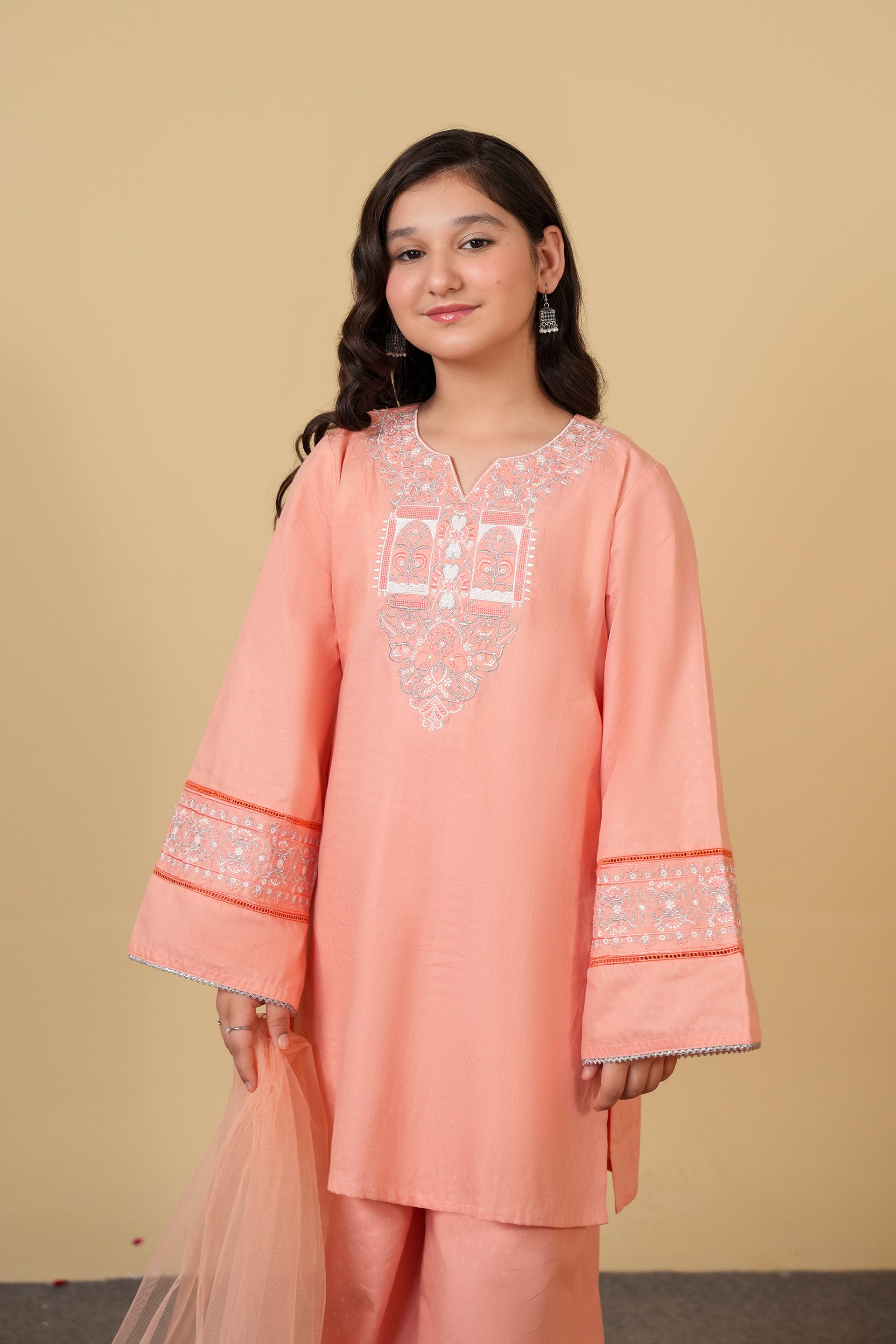 This suit combines traditional Eastern elegance with modern comfort, making it the perfect choice for young girls. The embroidered details and soft pastel tone give it a graceful, festive charm that’s timeless.