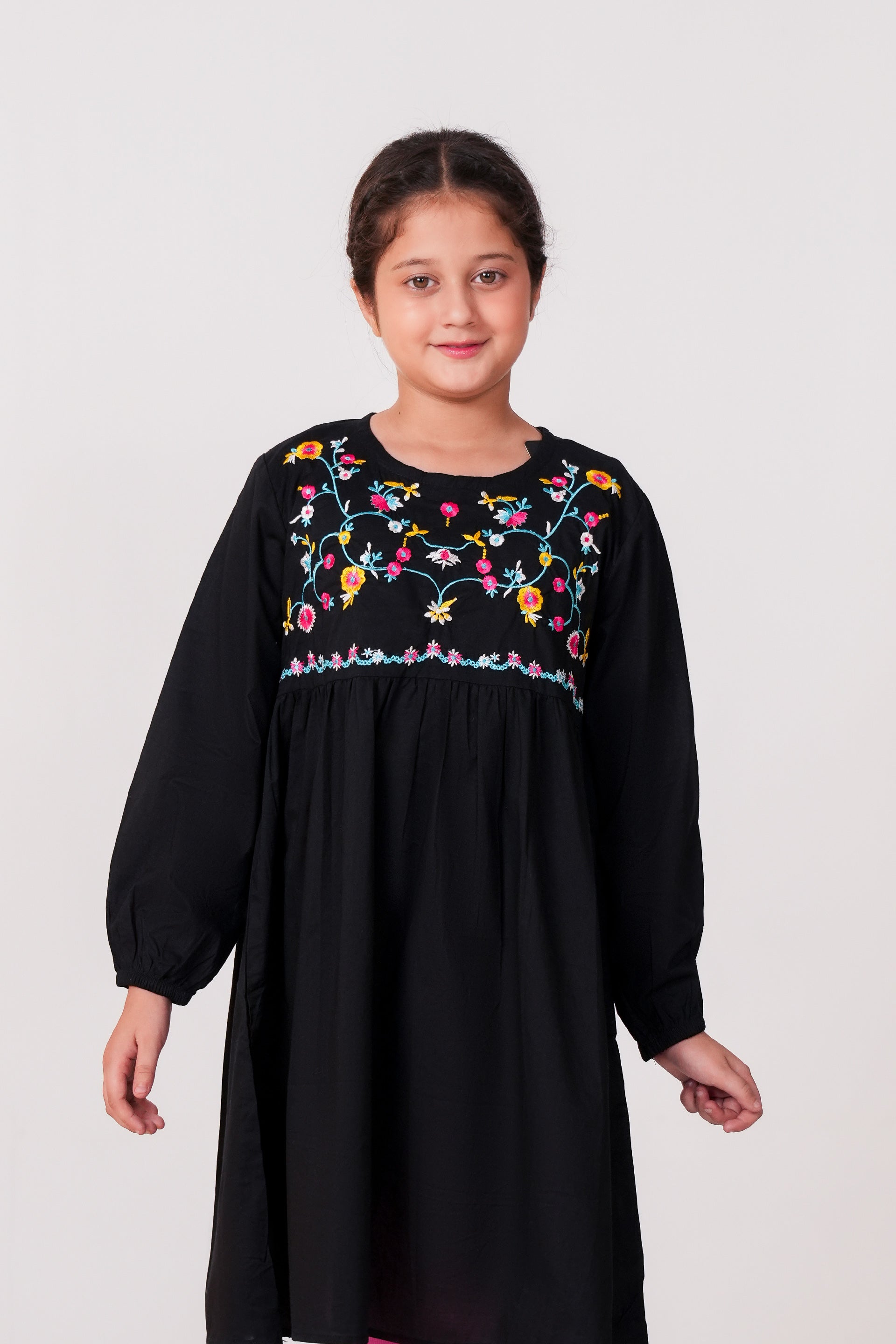Crafted from premium breathable cotton, this top is soft on delicate skin and perfect for all-day comfort. The front yoke showcases colorful floral embroidery in bright hues of yellow, pink, and blue—expertly created with high-precision multi-head embroidery technology for a neat, durable finish that retains its brilliance wash after wash.