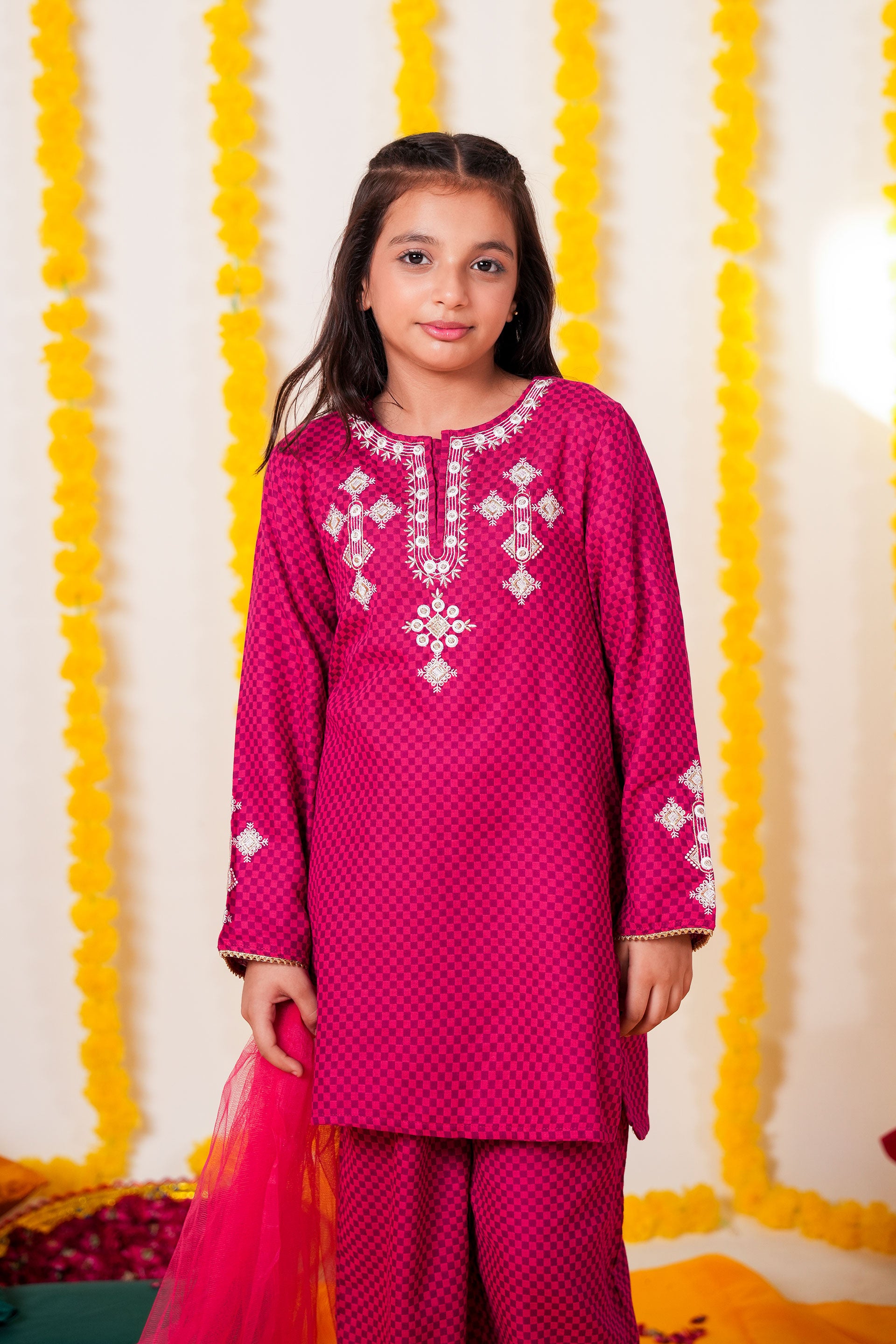 The deep pink check-patterned cotton creates a striking backdrop for the intricate gold detailing, ensuring your little one stands out at every gathering. Completing the ensemble is a matching pink net dupatta, bordered with subtle lace finishing, which enhances the outfit’s traditional charm and provides a graceful drape for formal events.