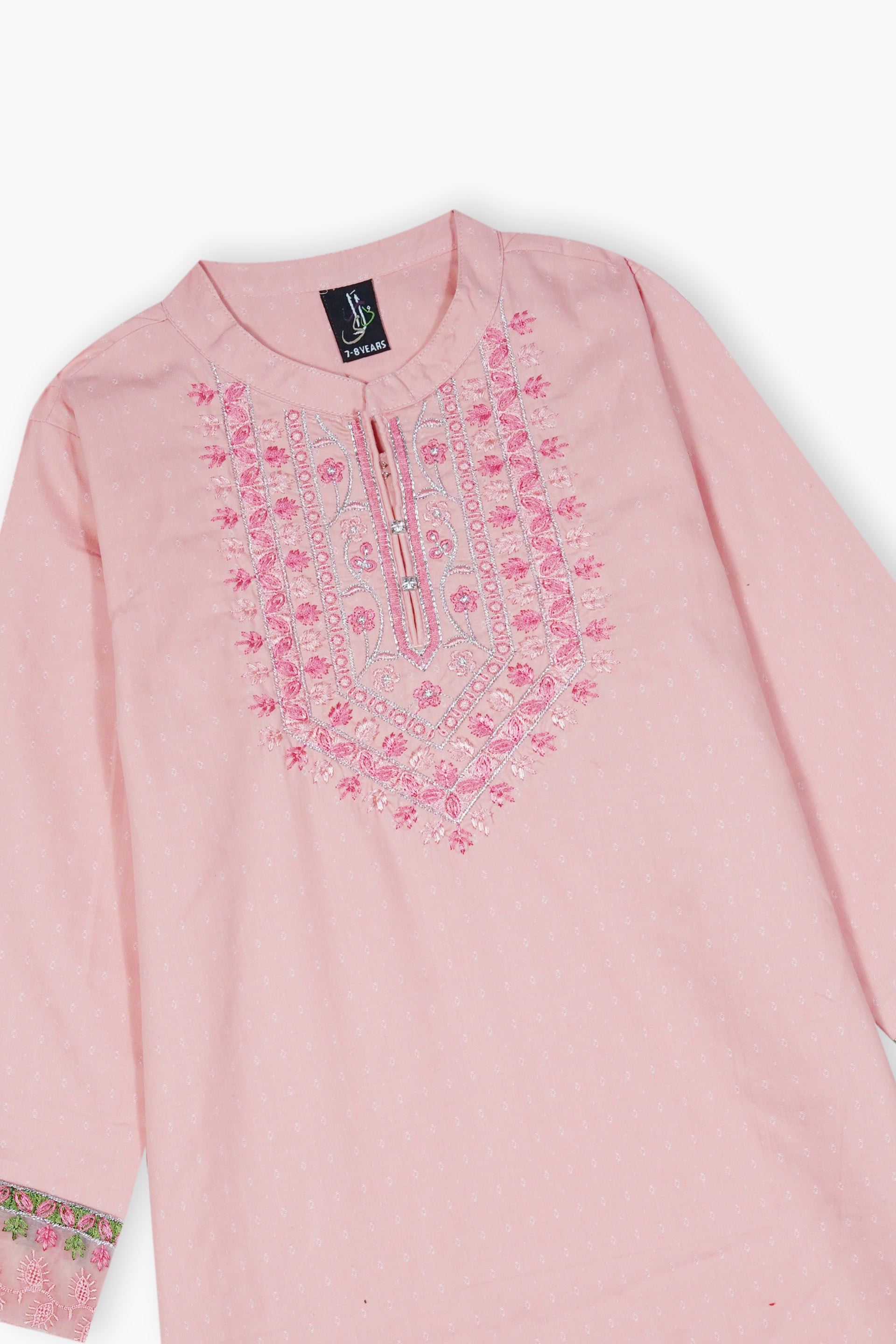 Paired with matching cotton trousers and a lightweight net dupatta with soft floral accents, this 3-piece ethnic set is ideal for festive celebrations, Eid, family gatherings, and special occasions. The soothing pastel shade adds charm, making it a perfect choice for young girls.