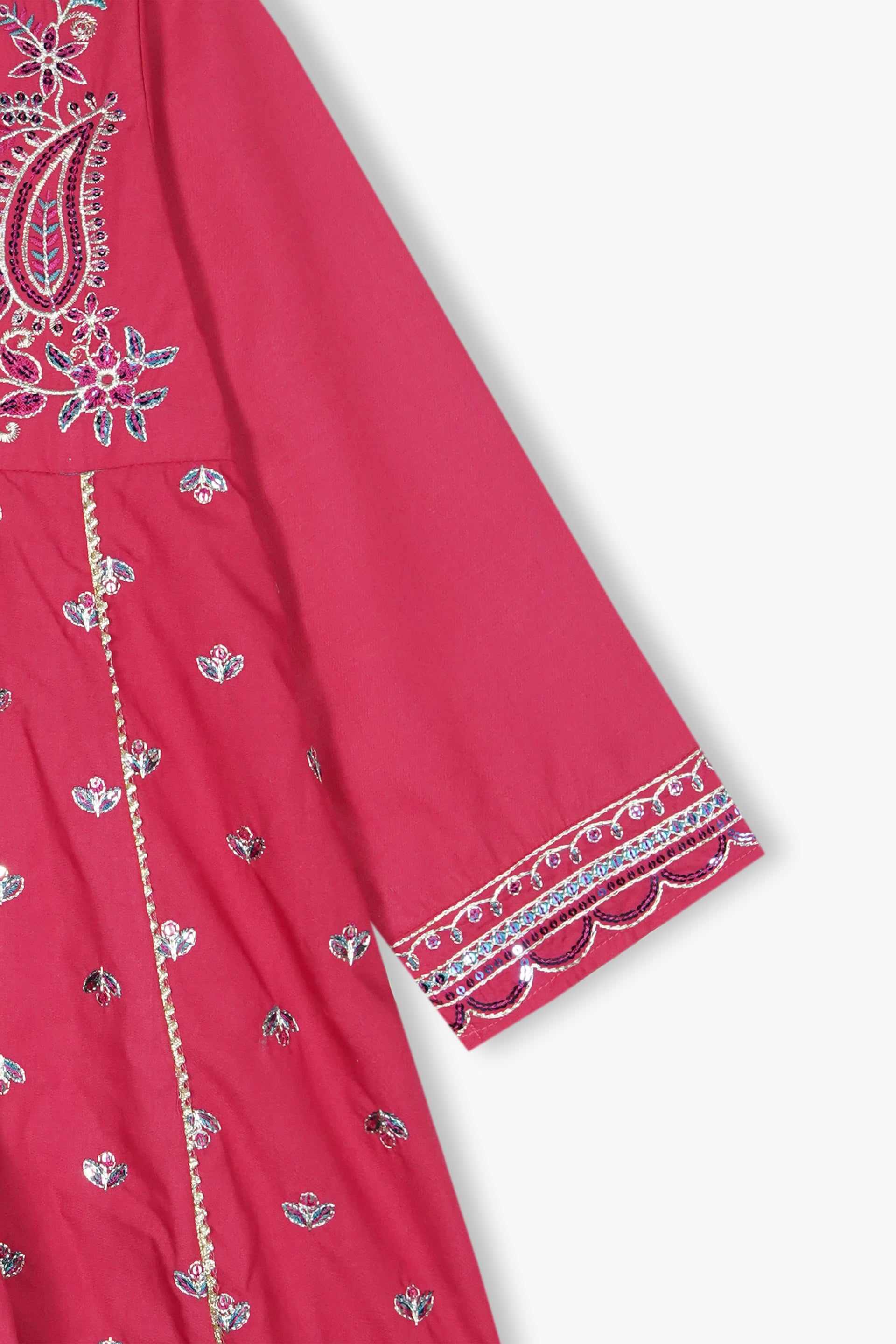 The kurta features intricate embroidery with delicate motifs, enhanced by a graceful flared silhouette that gives a stylish ethnic appeal. Paired with matching cotton trousers and a soft net dupatta with subtle detailing, this 3-piece set is perfect for festive occasions, family gatherings, Eid, weddings, and cultural celebrations.