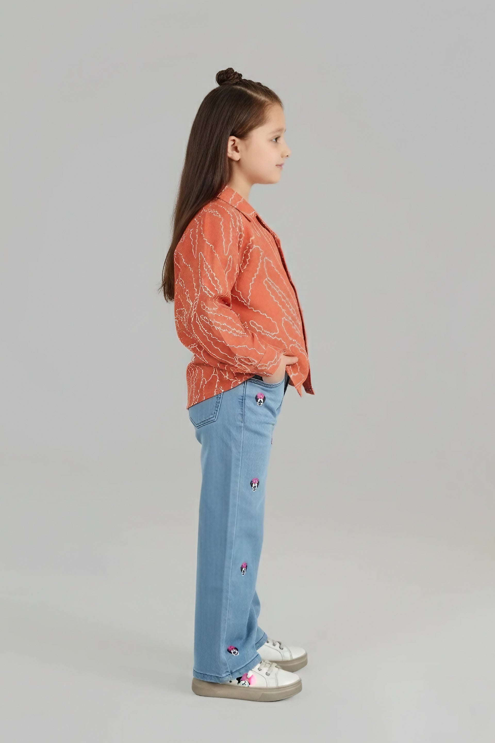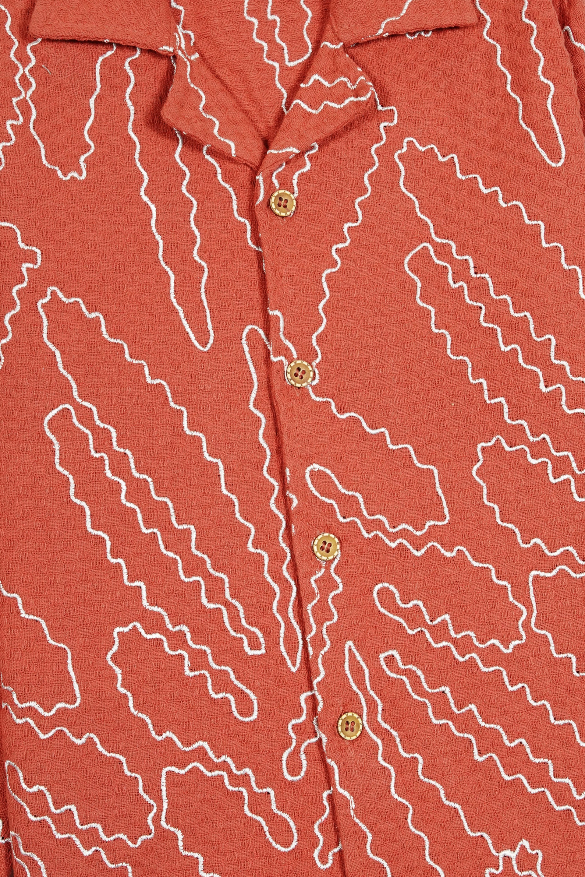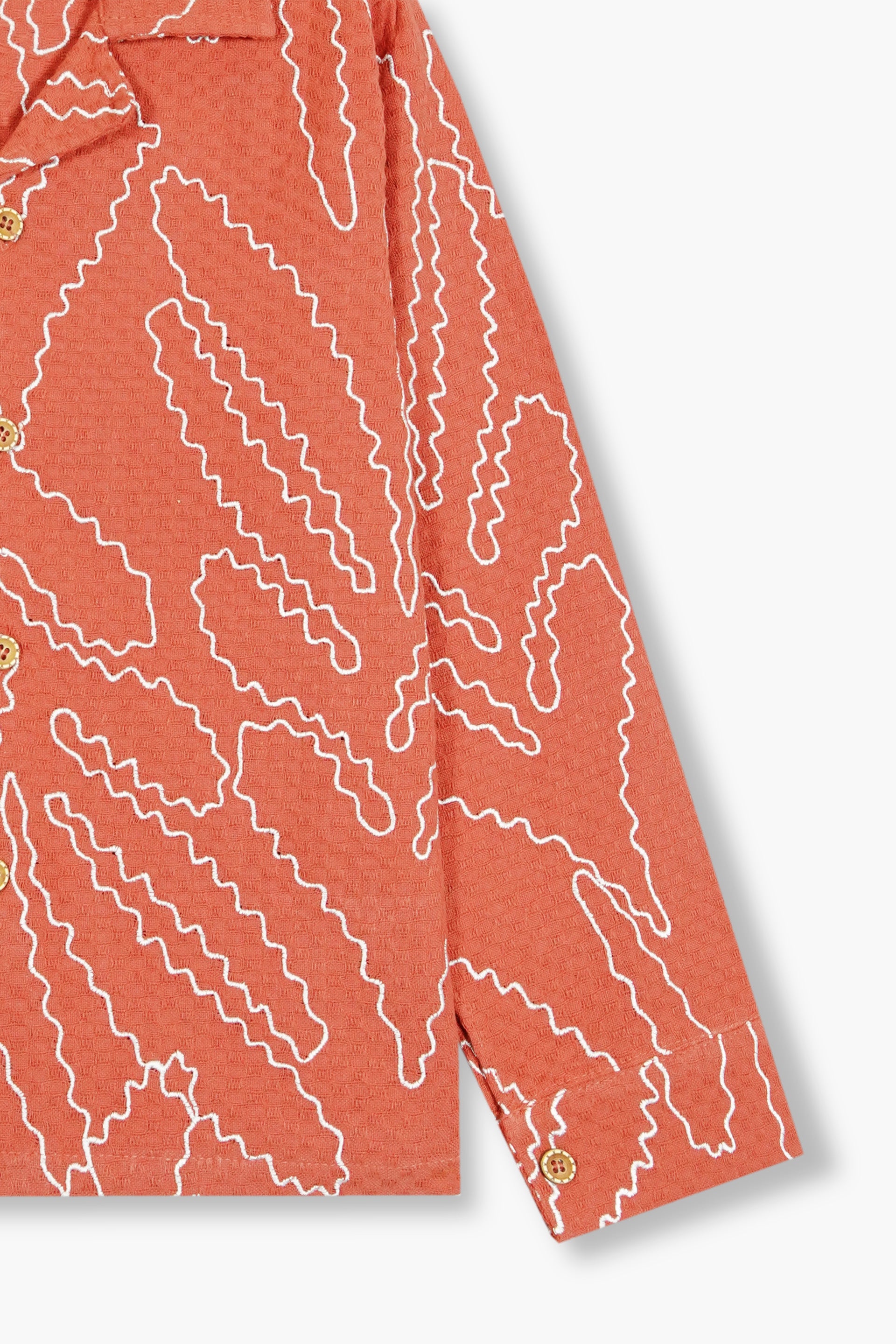 The rich terracotta orange hue and textured finish highlight the intricate embroidered detailing, giving this shirt a sophisticated yet playful look. Designed with full sleeves, a button-down front, and a relaxed collar, it ensures a polished and trendy fit for any setting.