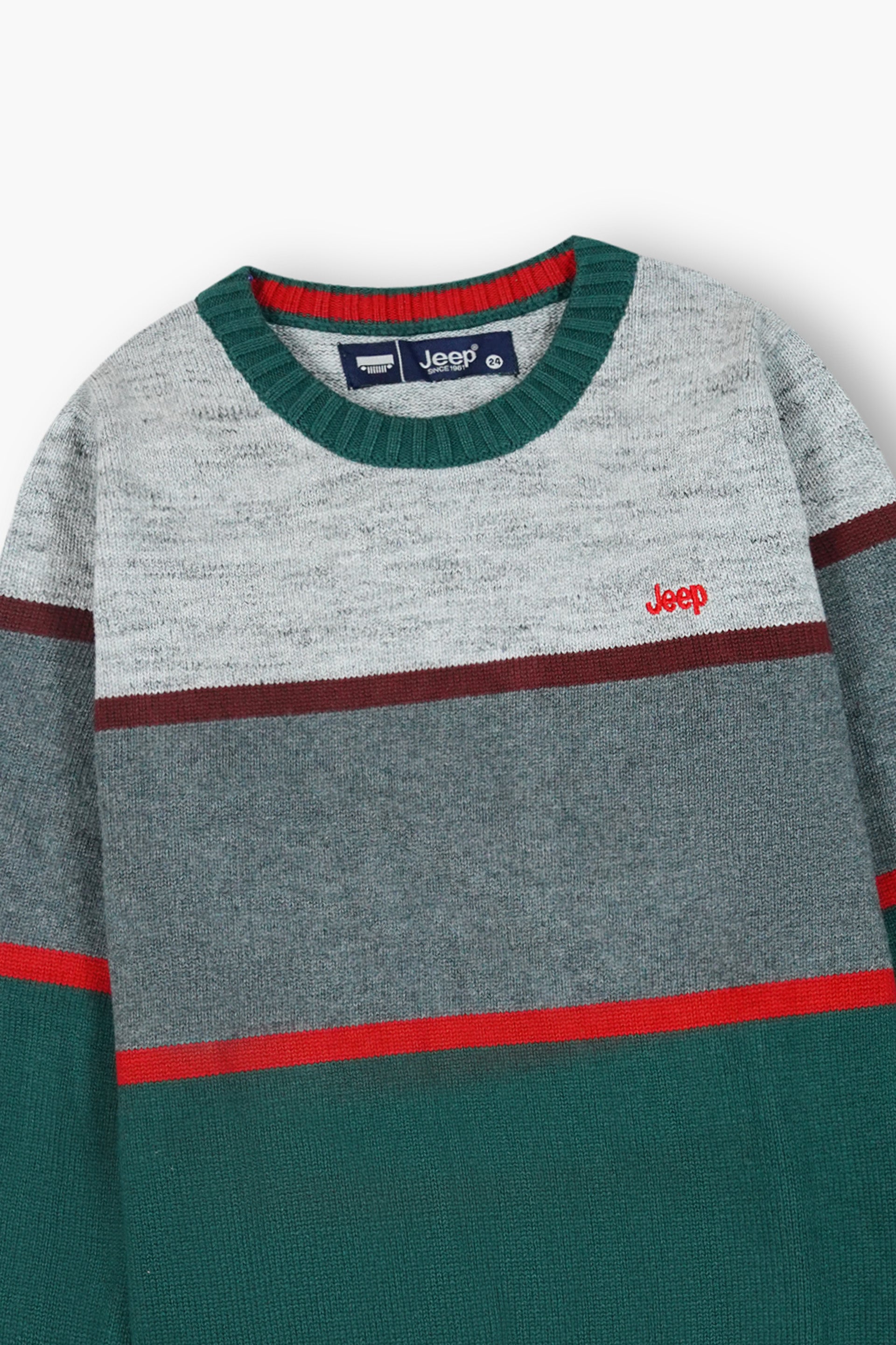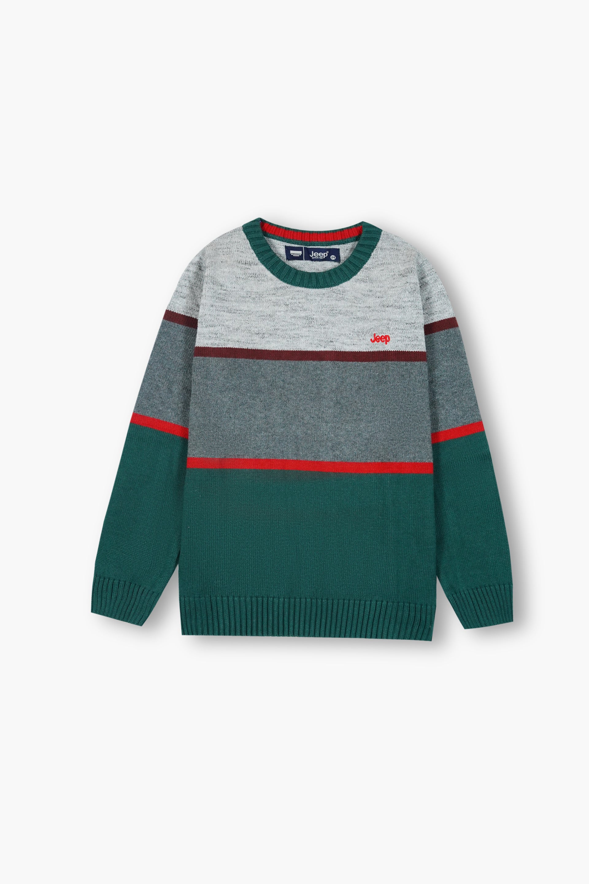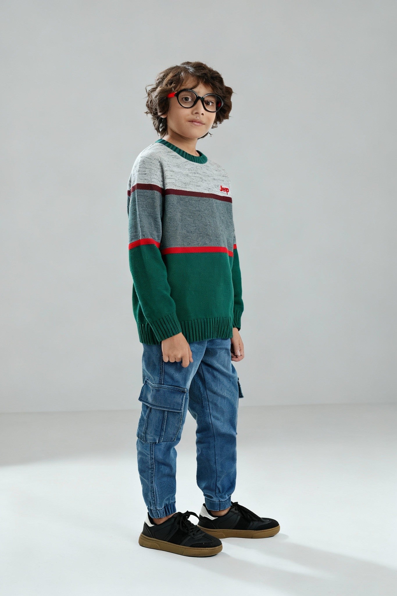 Keep your child warm and stylish this season with the Jeep Green & Grey Striped Cotton Sweater, crafted from 100% soft cotton for a cozy and breathable feel. Designed to provide warmth during chilly winter days, this sweater features a modern color-block pattern in shades of green, grey, and maroon with a pop of red stripe detailing for a trendy winter look.