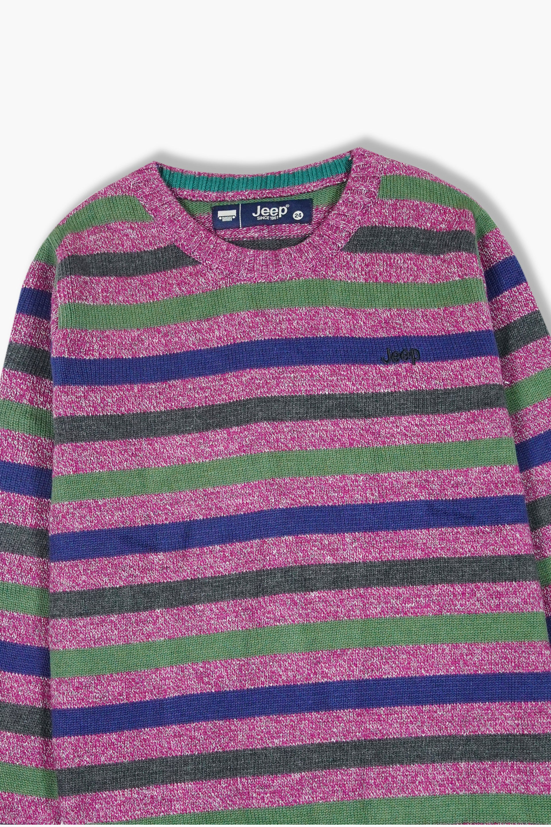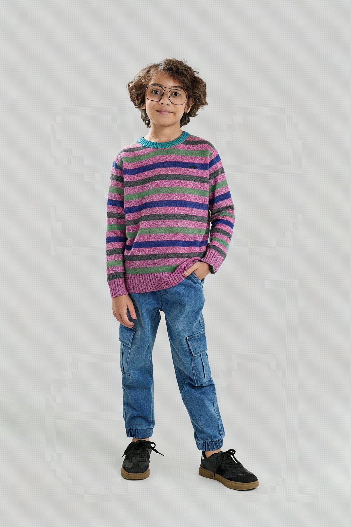 Add a pop of color to your child’s winter wardrobe with this Jeep Multicolor Striped Cotton Sweater, crafted from 100% pure cotton for a soft, breathable, and cozy feel. Designed to keep kids comfortably warm during chilly days, this vibrant sweater combines style and warmth with its playful mix of purple, green, grey, and navy stripes.