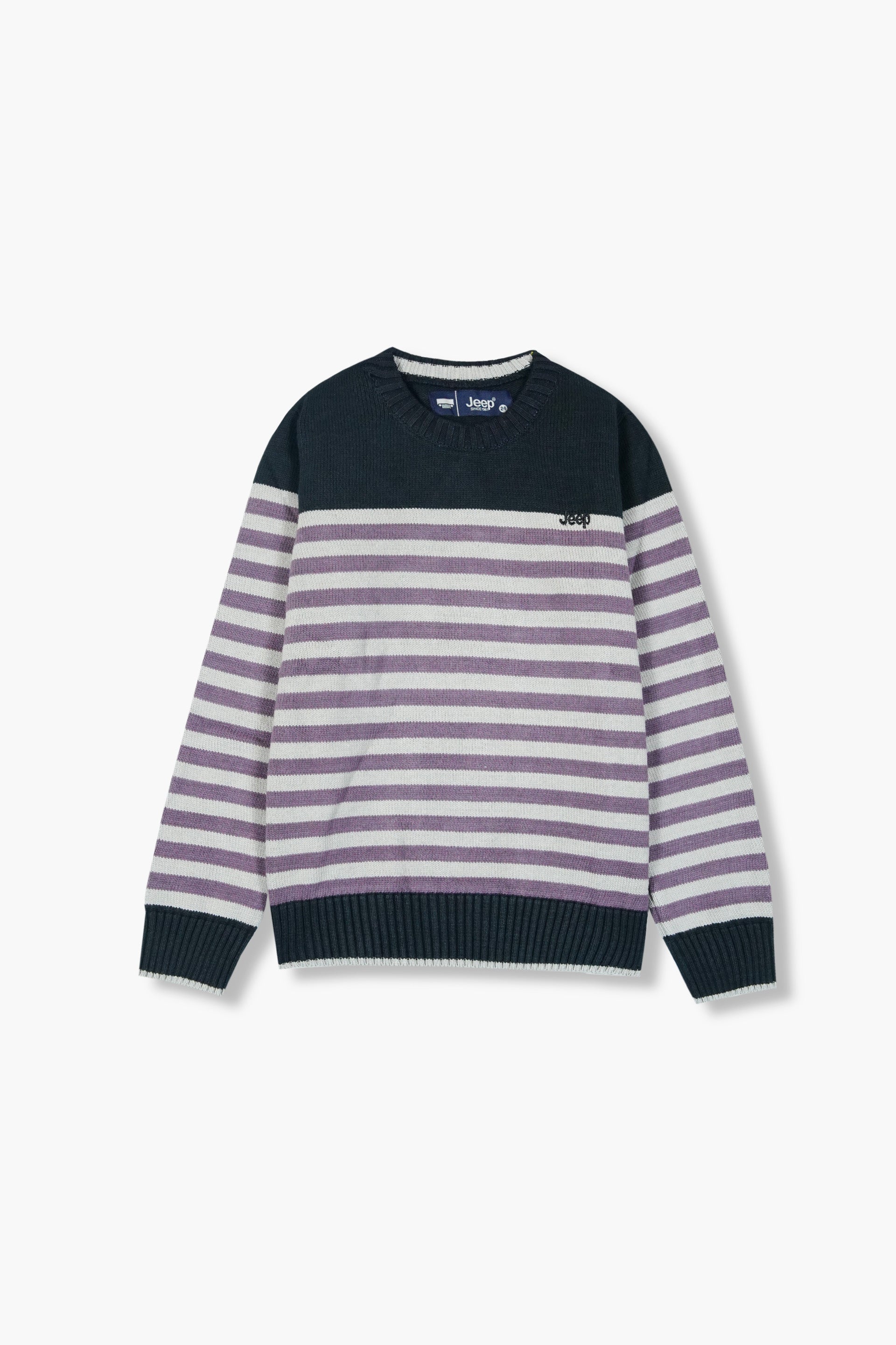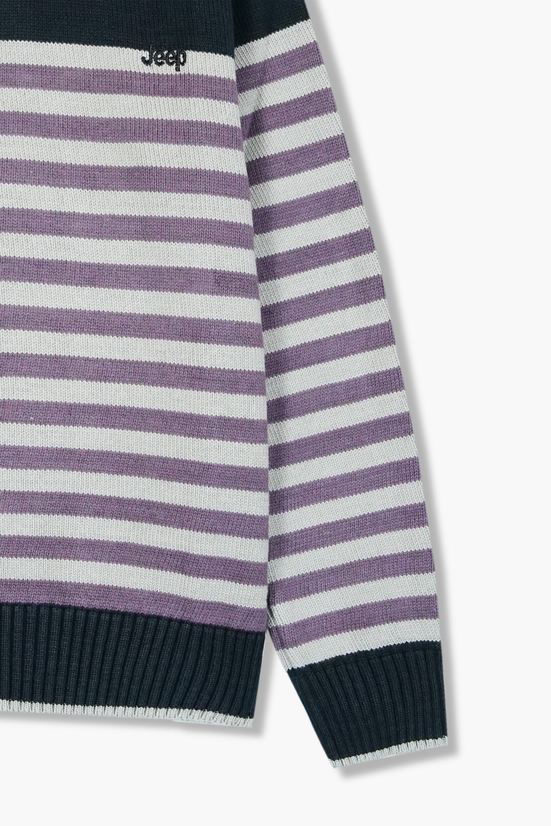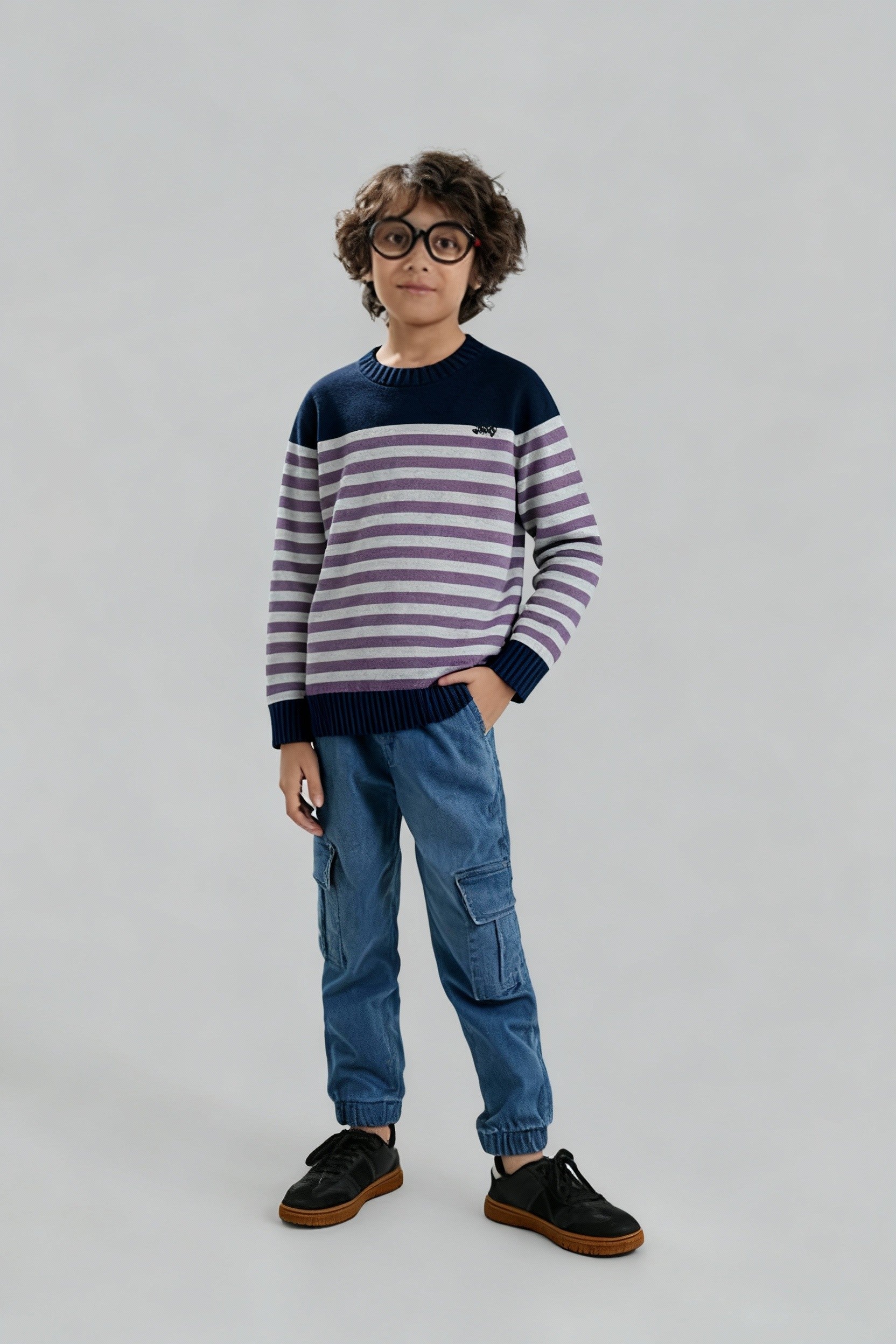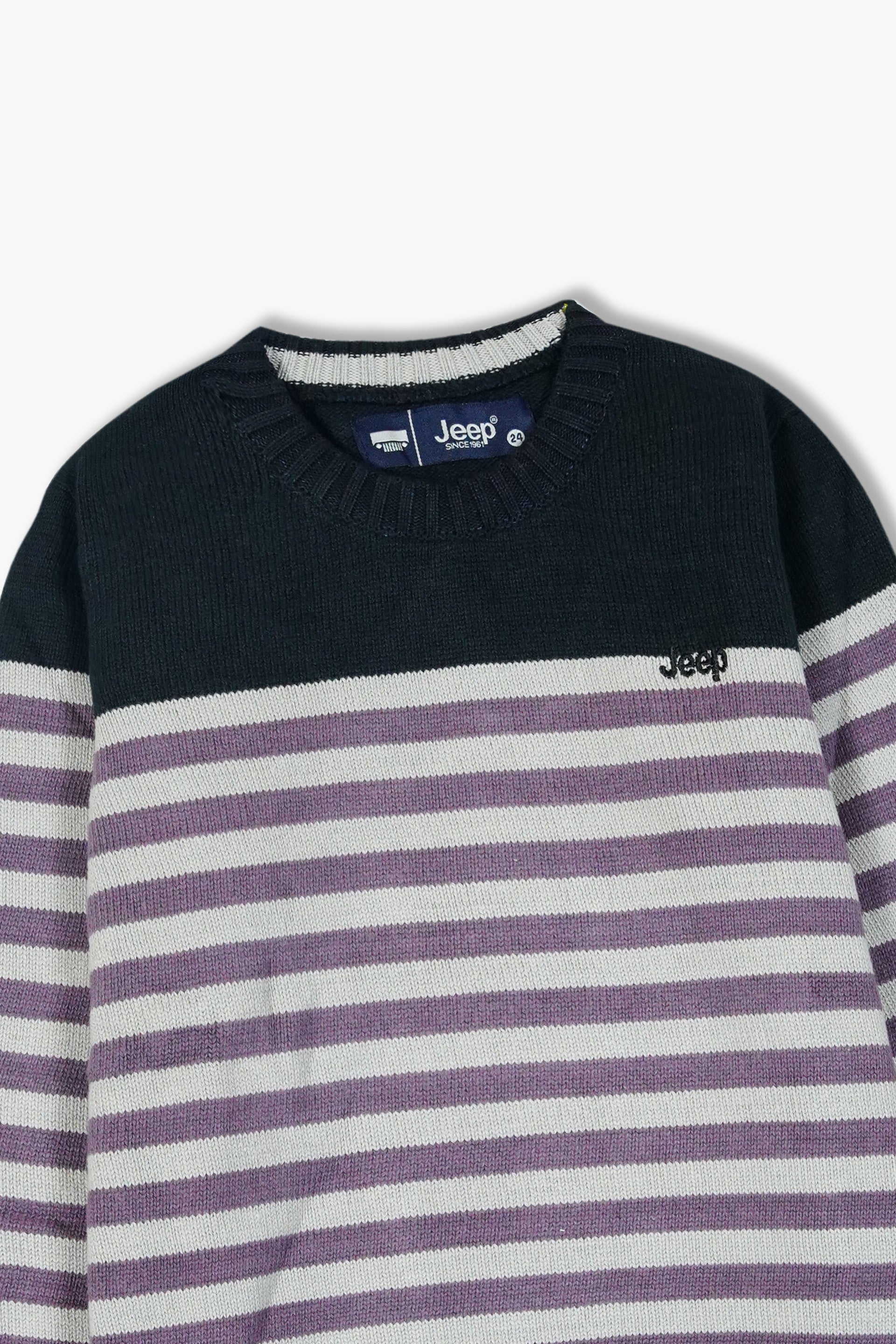 Stay warm in style with this Jeep Striped Cotton Sweater, crafted from 100% premium cotton for unbeatable comfort and breathability. Designed to keep kids cozy during chilly winter days, this sweater features a classic striped pattern in soft lavender, cream, and navy hues — giving it a timeless, sporty appeal.
