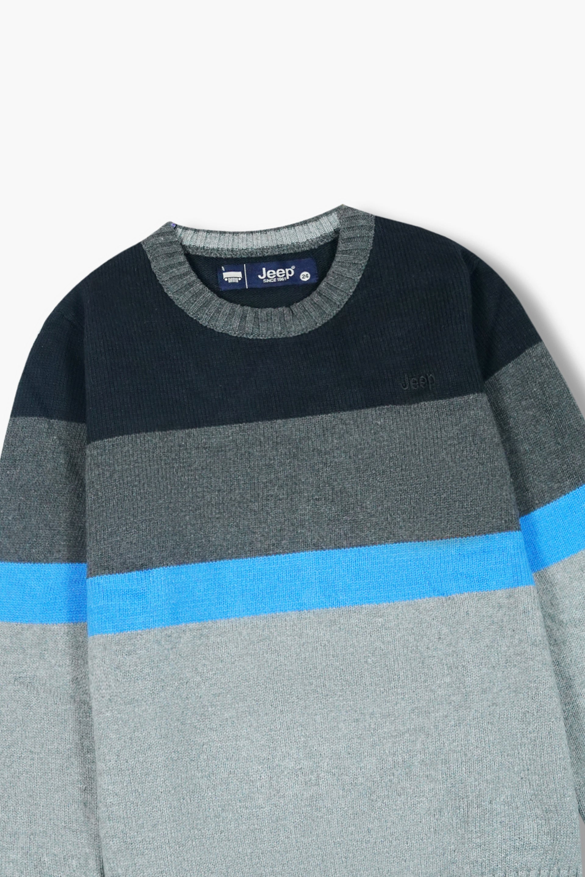 The modern color-block stripe design in shades of grey, charcoal, and sky blue adds a trendy yet classic touch, while the ribbed cuffs, neckline, and hem offer a snug fit that keeps the chill away. Whether it’s a school day or a casual outing, this sweater pairs perfectly with jeans or joggers for a cool winter look.
