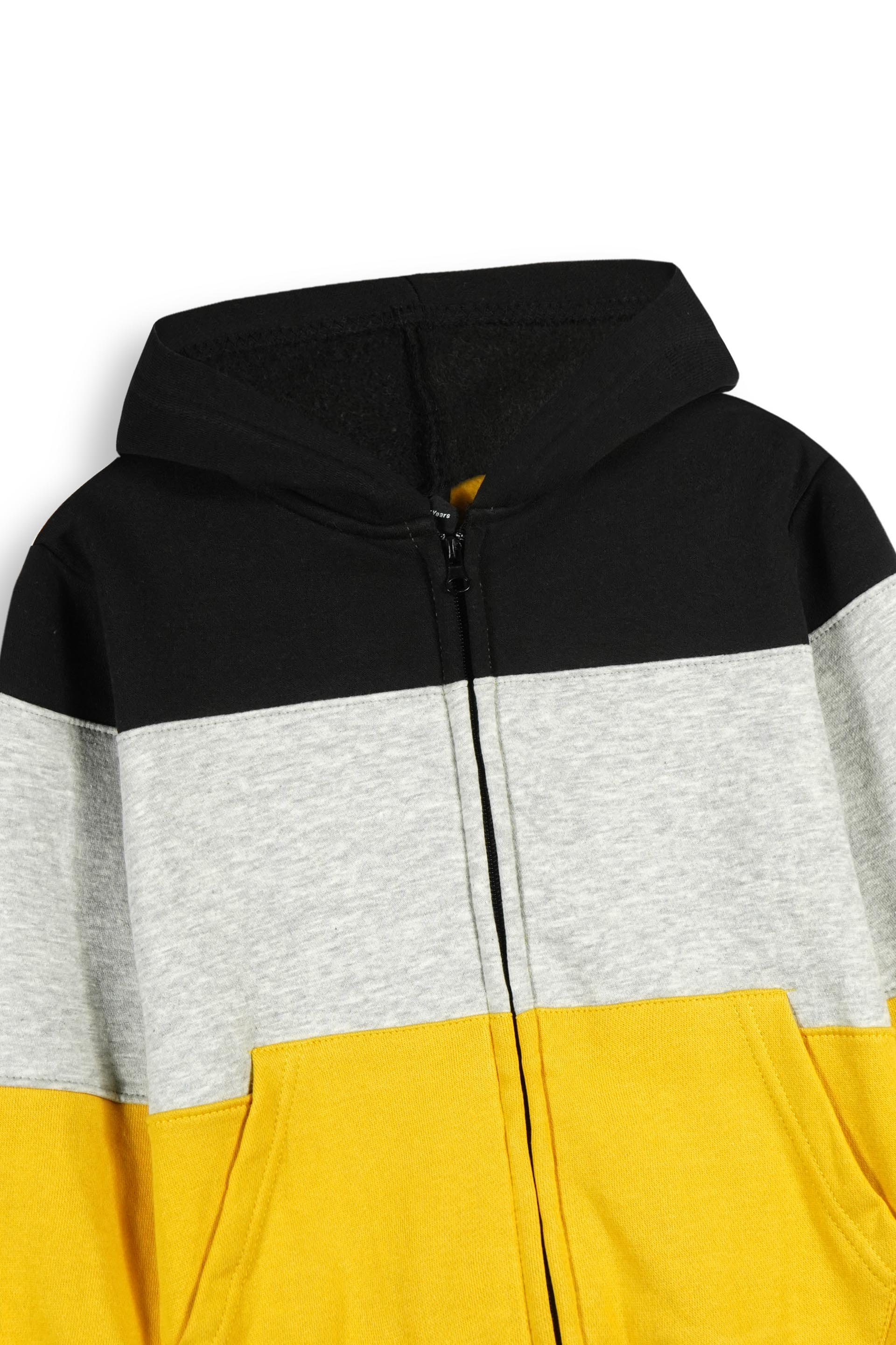 Designed in bold contrasting panels of black, grey, and mustard yellow, this hoodie offers a modern, sporty look that stands out in any setting. The full front zipper allows for easy layering, while the roomy kangaroo pockets provide both style and practicality for keeping little hands warm.