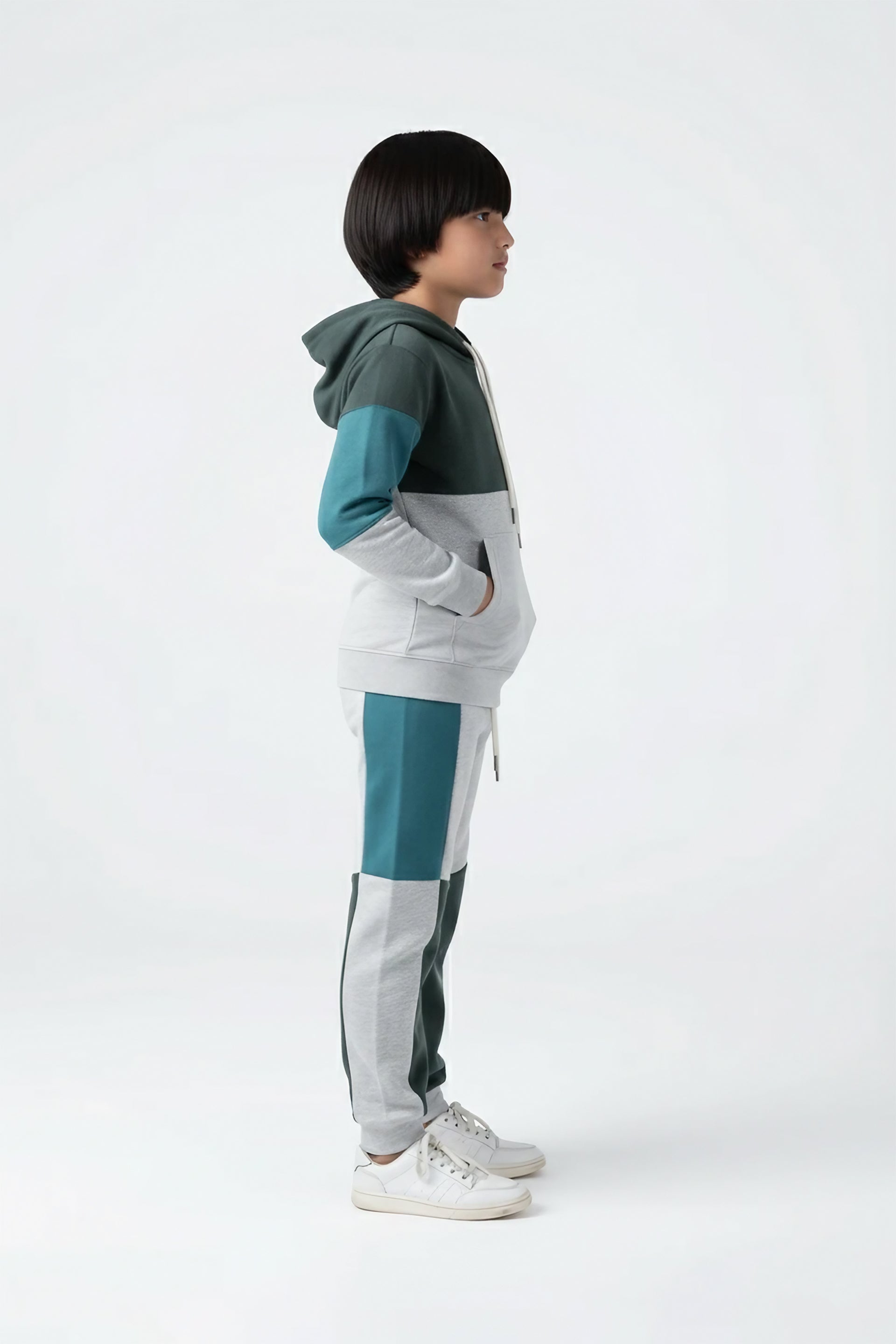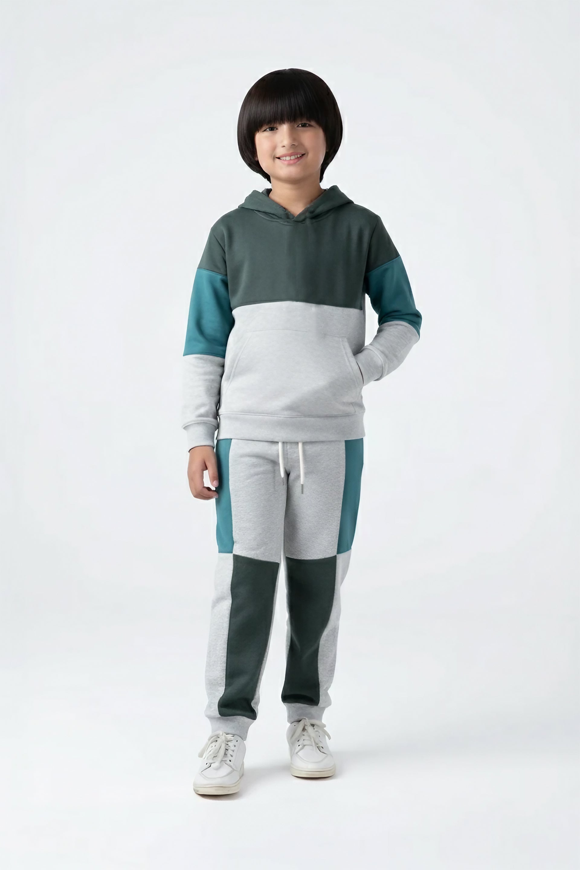 Keep your little one warm and stylish with this cozy fleece tracksuit, designed for all-day comfort and effortless cool. Made from soft, premium fleece, this two-piece set features a modern colorblock design with contrast panels in grey, teal, and charcoal.