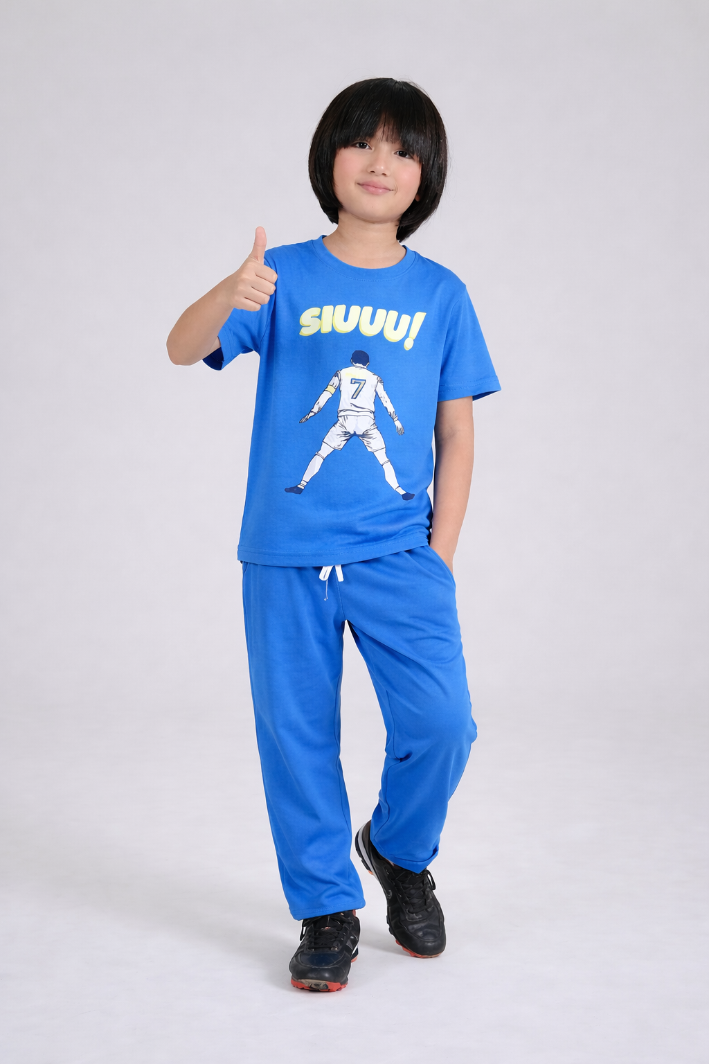 Fuel their football fever with this ultimate Cristiano Ronaldo "SIUUU!" 2-Piece Co-ord Set. Designed for young fans of the legendary CR7, this set combines athletic performance with iconic street style. Whether they are practicing their goal celebrations on the pitch or hanging out with friends, this vibrant blue tracksuit ensures they look and feel like a pro.