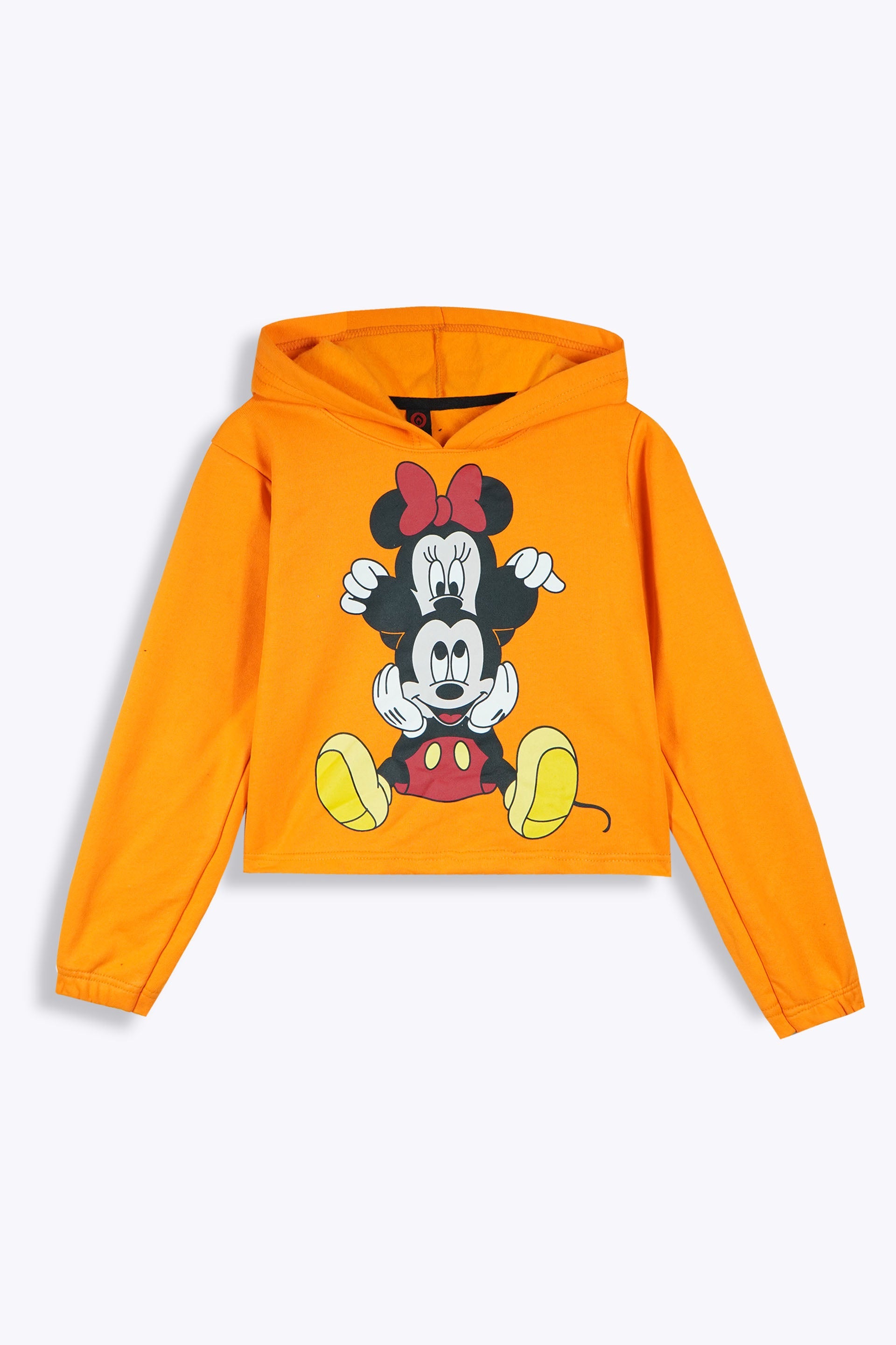 Add a pop of color and classic Disney charm to your child’s wardrobe with this vibrant Mickey & Minnie fleece tracksuit! The cozy fleece set features a cropped orange hoodie with an adorable front print of Mickey and Minnie Mouse playing peekaboo, paired with wide-leg black cargo pants for a trendy street-style look.
