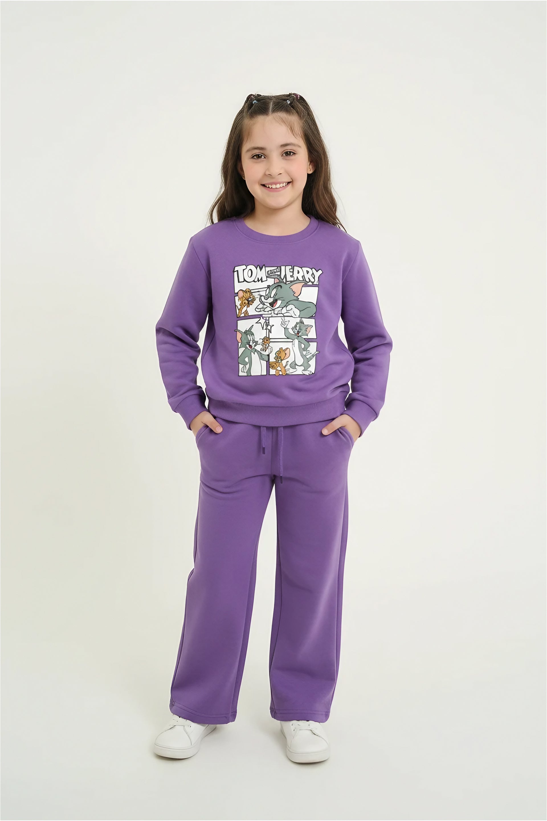 The set features a long-sleeve sweatshirt with a vibrant Tom & Jerry cartoon print, capturing the fun and nostalgia of the classic animated duo. The matching wide-leg trousers offer a relaxed fit with an adjustable drawstring waistband, ensuring all-day comfort and easy movement.