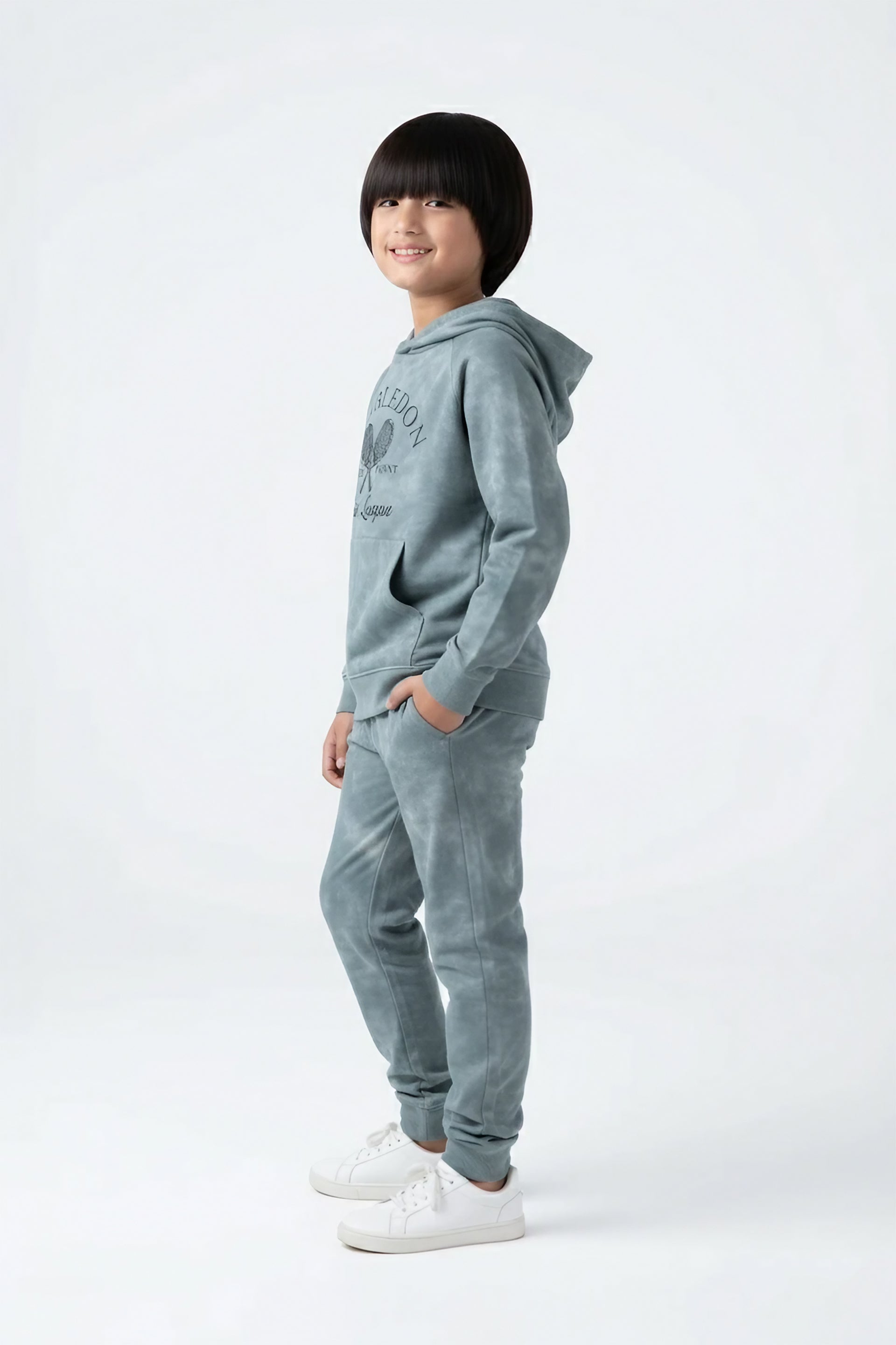 The hoodie features a trendy tie-dye effect with a bold “Wimbledon Tennis League” print, complete with a roomy kangaroo pocket and ribbed cuffs. Paired with matching jogger pants that include an elastic waistband and side pockets, this outfit combines practicality with modern streetwear style.