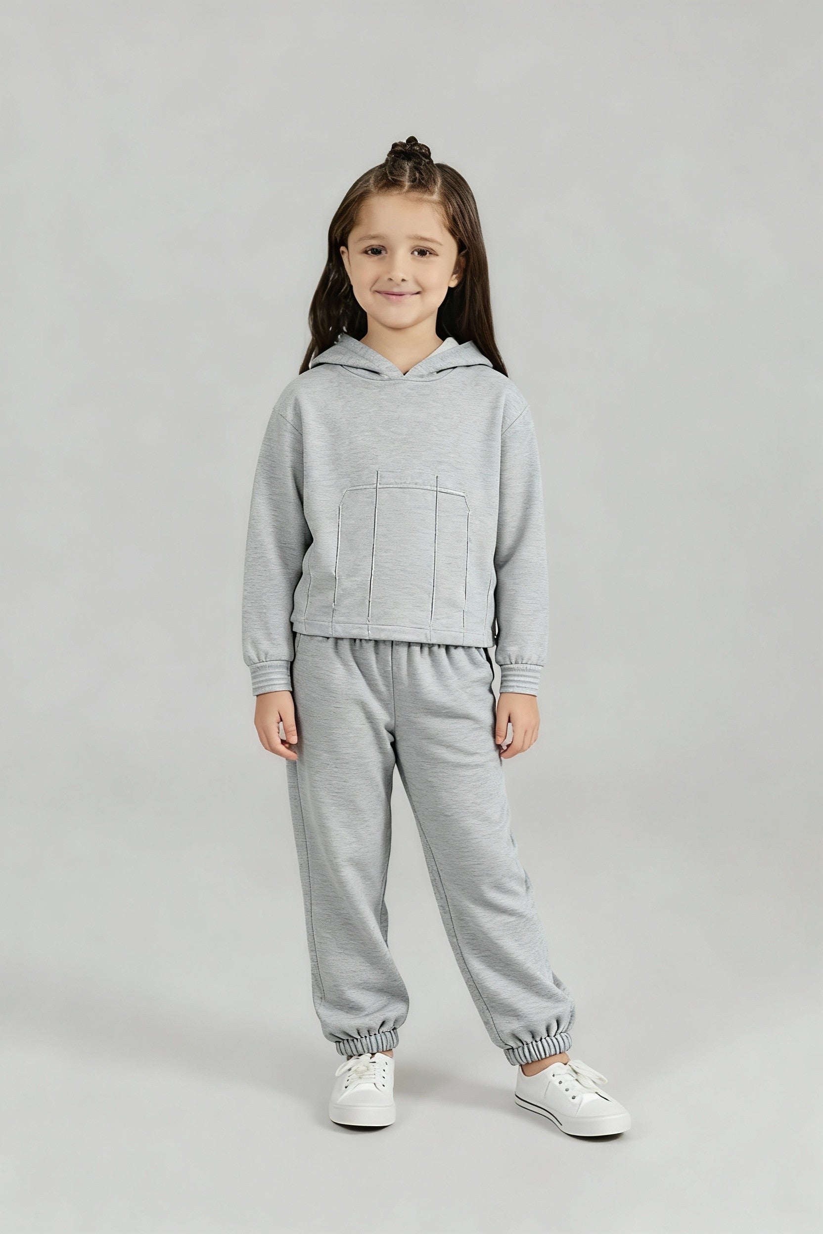 Keep your little one snug and stylish all season long with our Light Grey Fleece Hoodie Suit. Made from 100% cotton fleece, this two-piece set offers unbeatable warmth and comfort for chilly days. The hoodie features soft inner lining, clean vertical stitch detailing, and a relaxed fit that gives a trendy streetwear vibe. The matching jogger pants come with an elastic waistband and cuffed hems for a secure, easy fit — perfect for active kids.