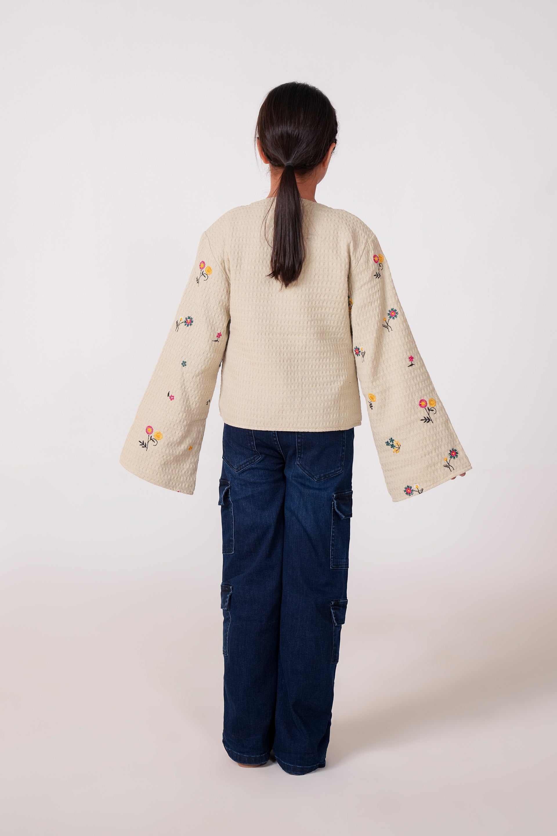 Keep your little fashionista cozy and chic this season with our Light Grey Jacquard Embroidered Jacket Top. Made from premium jacquard fabric, this stylish piece features all-over floral embroidery in soft, playful hues of yellow, pink, and teal — adding a delicate handcrafted charm to the winter look. The jacket-style top is designed with wide sleeves, a front button closure, and a structured silhouette that provides both warmth and elegance.