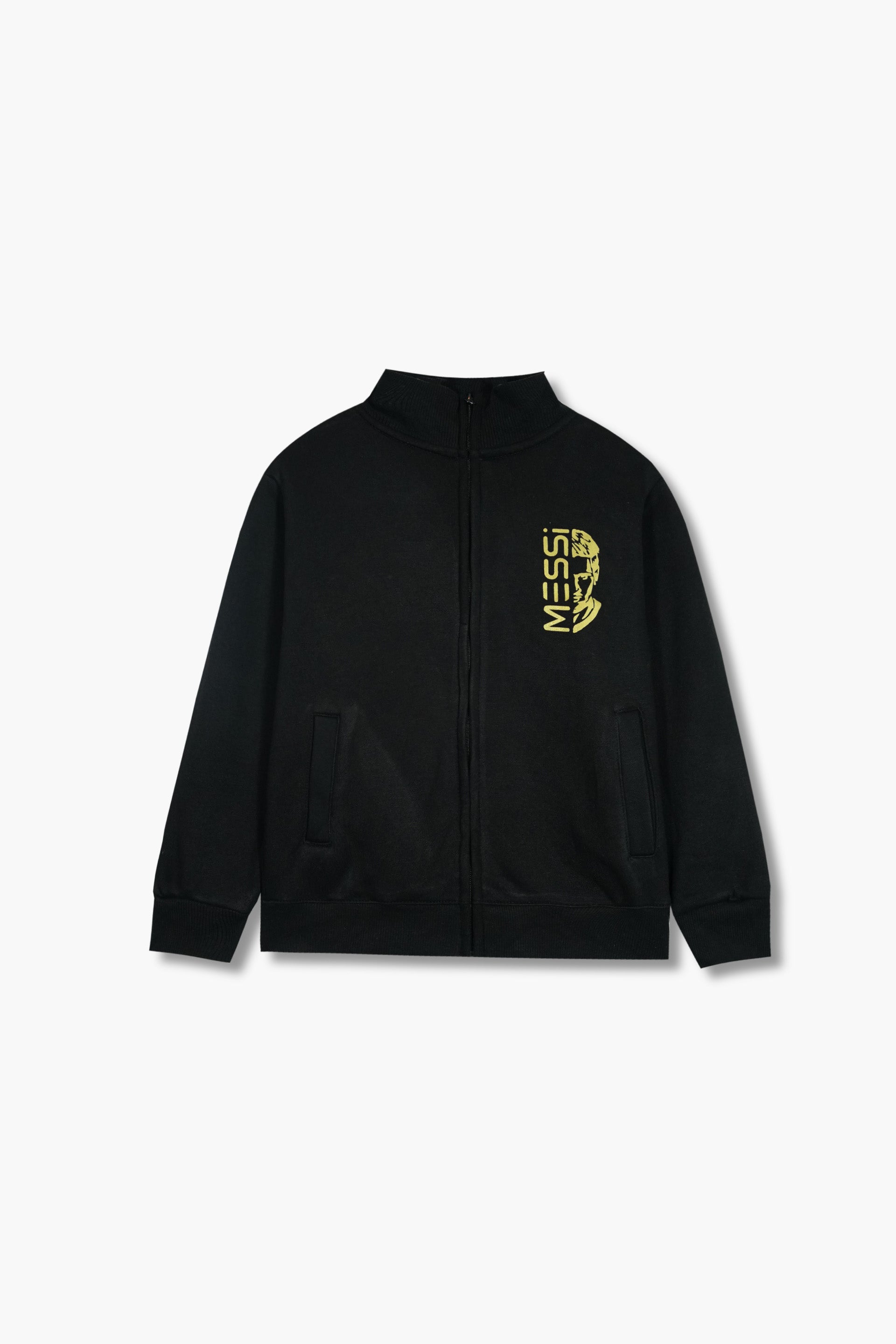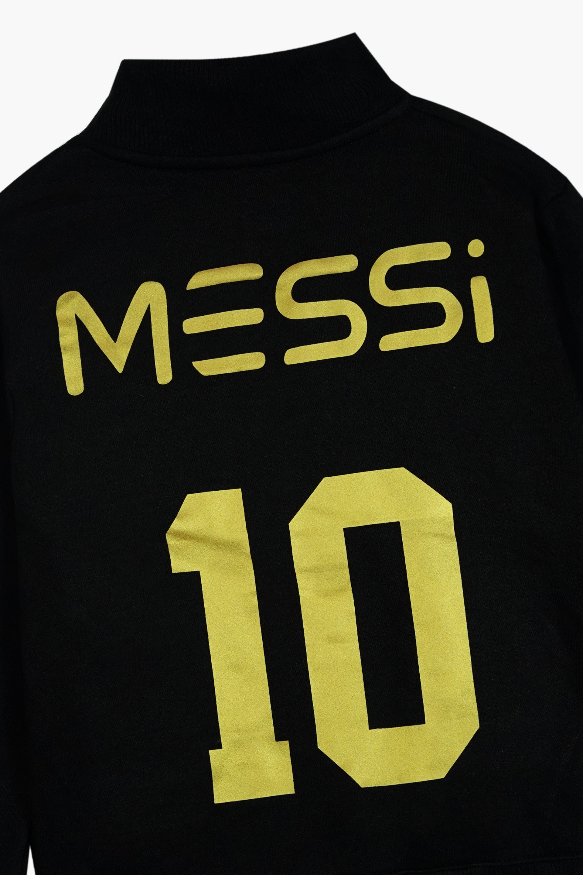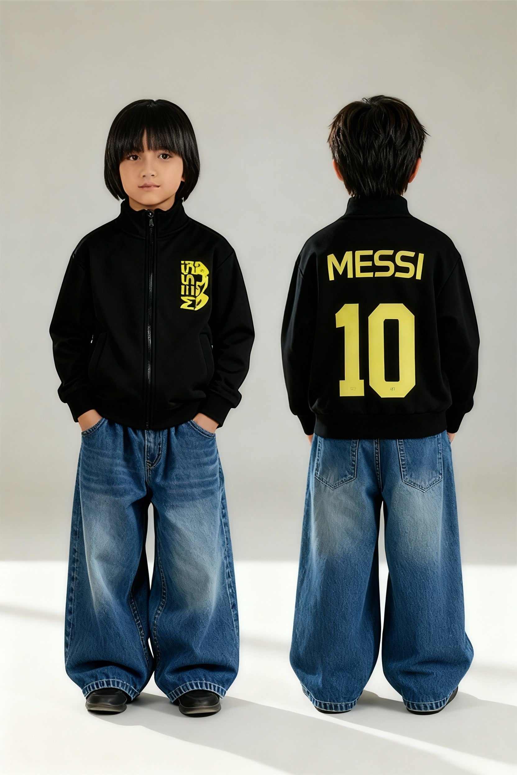 The black base with gold Messi print on both the front and back adds a bold, athletic touch — perfect for school, casual outings, or playtime. With a full zipper closure, ribbed cuffs and hem, and two front pockets, it’s both practical and stylish.