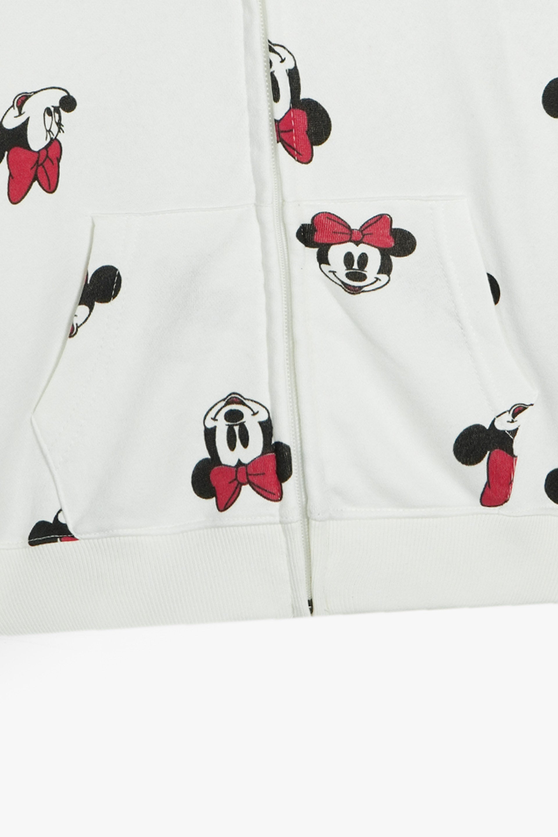 Featuring an all-over Minnie Mouse print with her iconic red bow, this hoodie adds a playful, stylish touch to any outfit. The soft cotton Terry fabric feels gentle on the skin, while the zip closure, ribbed cuffs, and front kangaroo pockets make it both practical and adorable.