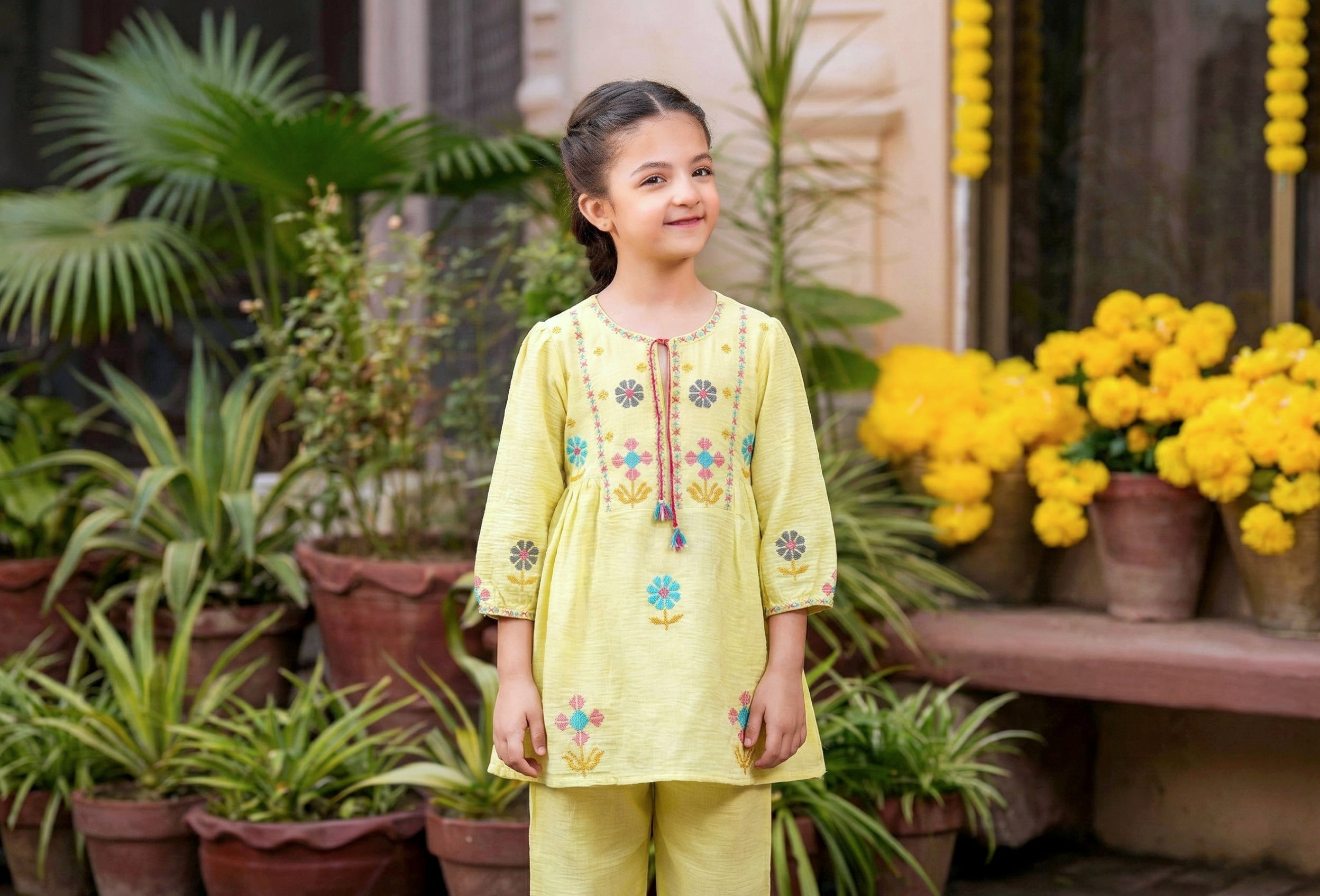 This charming pastel yellow kurta and pant set features delicate multicolor floral embroidery that adds a playful yet elegant touch. The kurta is designed with a gathered waist, round neckline, and three-quarter puff sleeves, beautifully highlighted with intricate embroidered motifs on the front and sleeves. The matching pants complement the look with coordinated embroidery along the hem, creating a balanced and graceful ensemble. Crafted from soft, breathable fabric, this set is perfect for festive occasions, casual outings, or special celebrations, offering both comfort and timeless style.