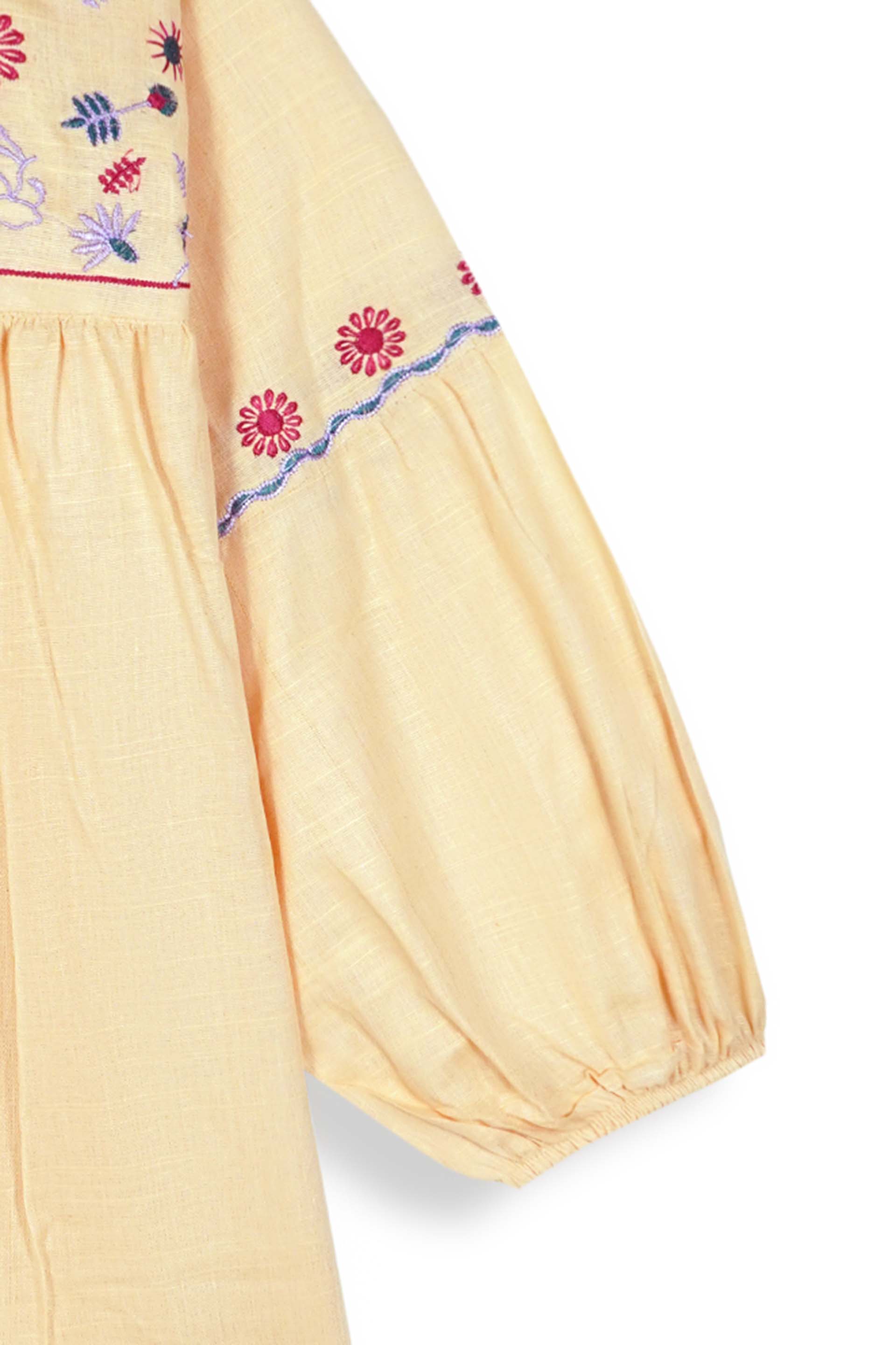 Multi-colored floral embroidery on yoke, sleeves, and hemline