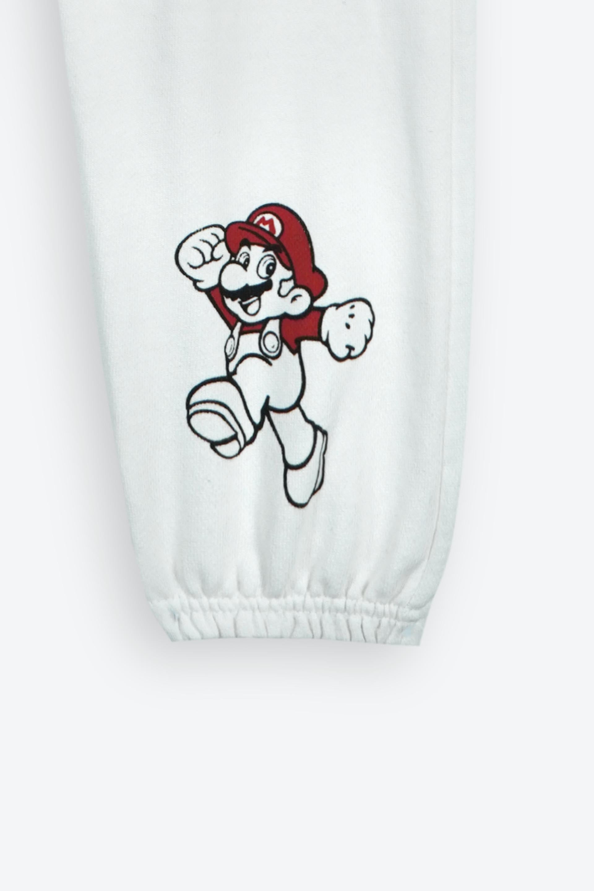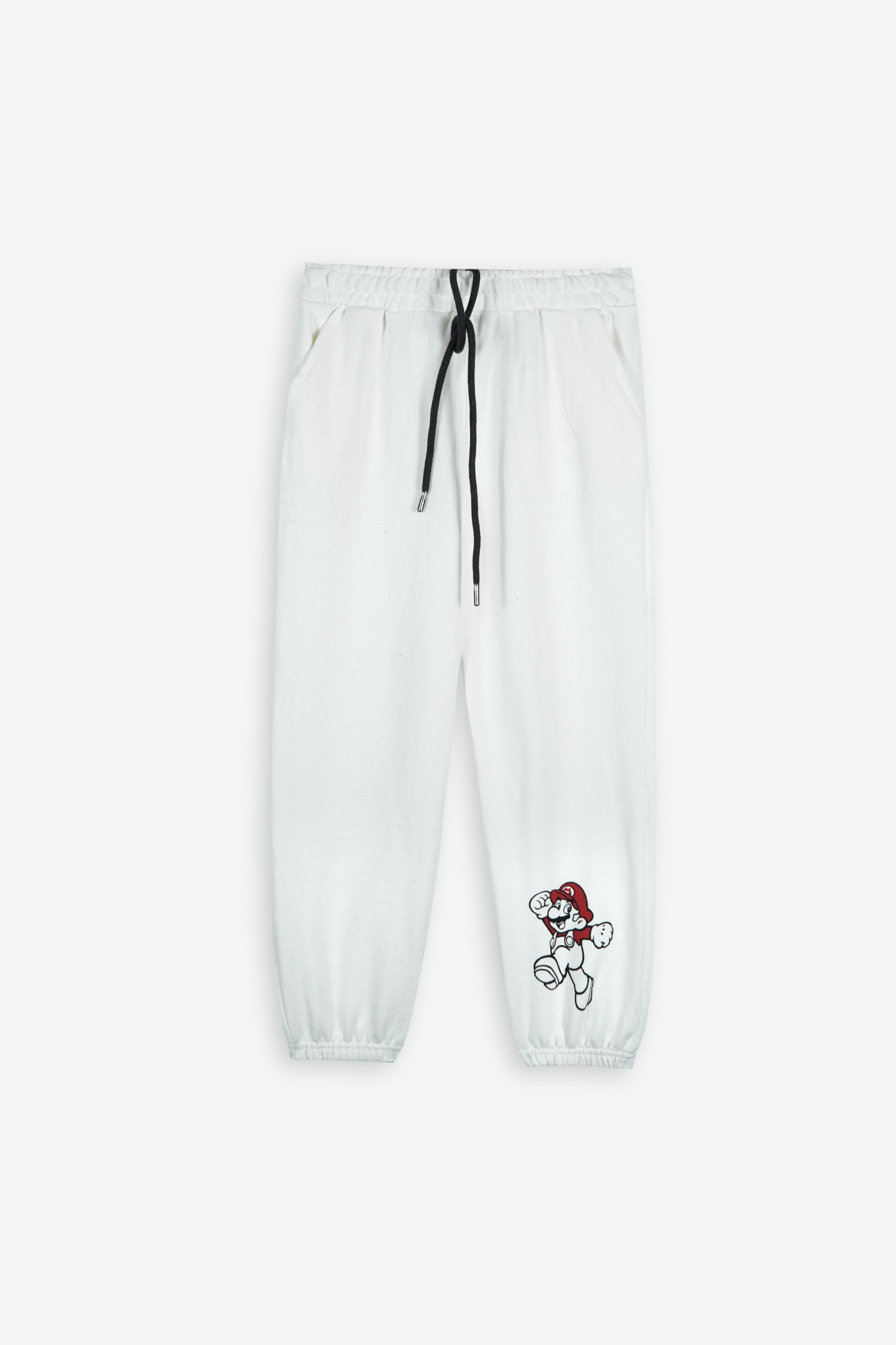 Jogger Details: Elastic waistband with adjustable black drawstring, ribbed ankle cuffs, and a matching Super Mario character print near the hem.