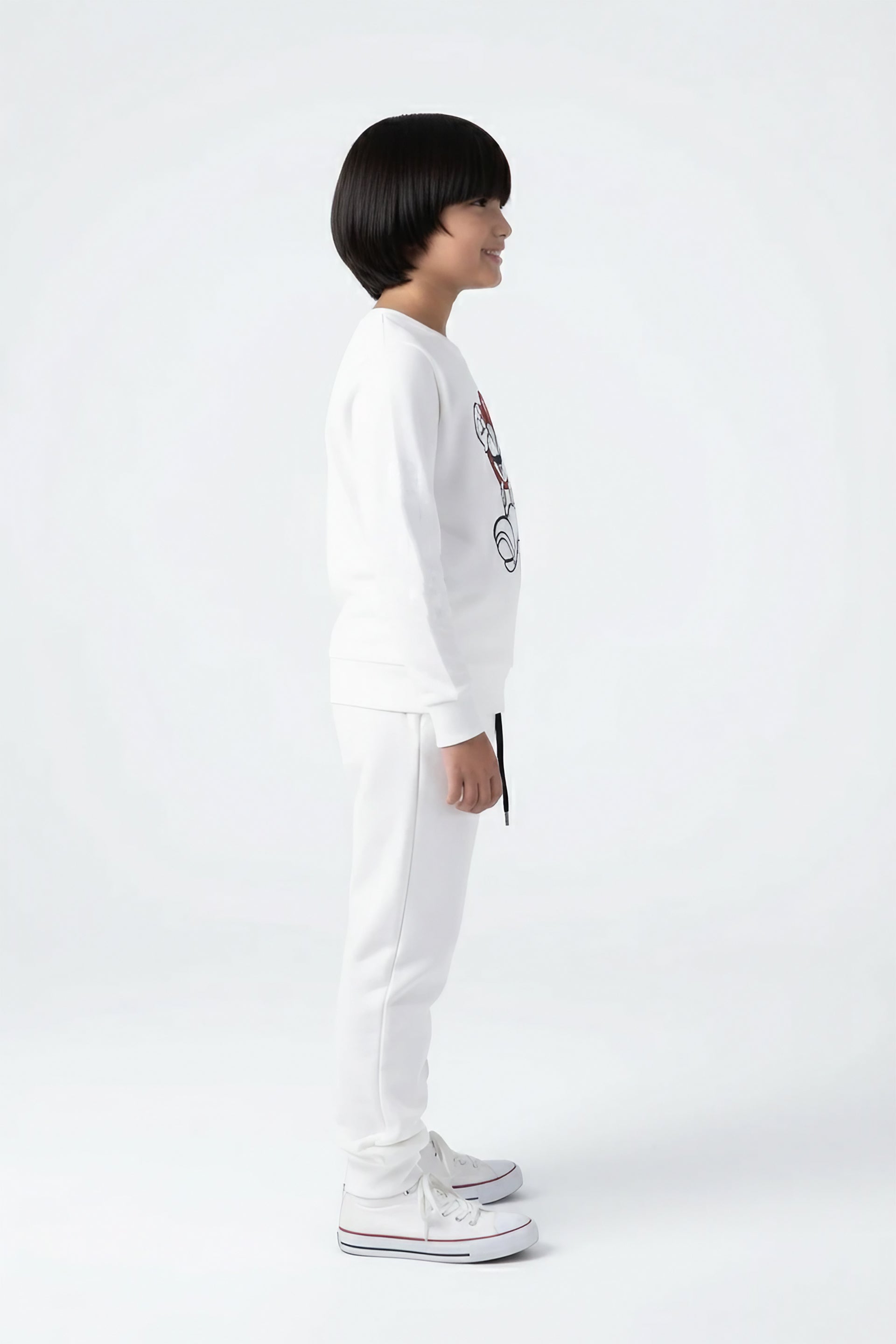 Level up your child’s style with this Super Mario kids tracksuit, crafted from 100% premium cotton terry fabric for comfort, durability, and all-day wearability. Designed in a crisp white color, this set includes a long-sleeve sweatshirt and jogger pants, both featuring bold Super Mario character prints—perfect for young fans of the iconic video game.