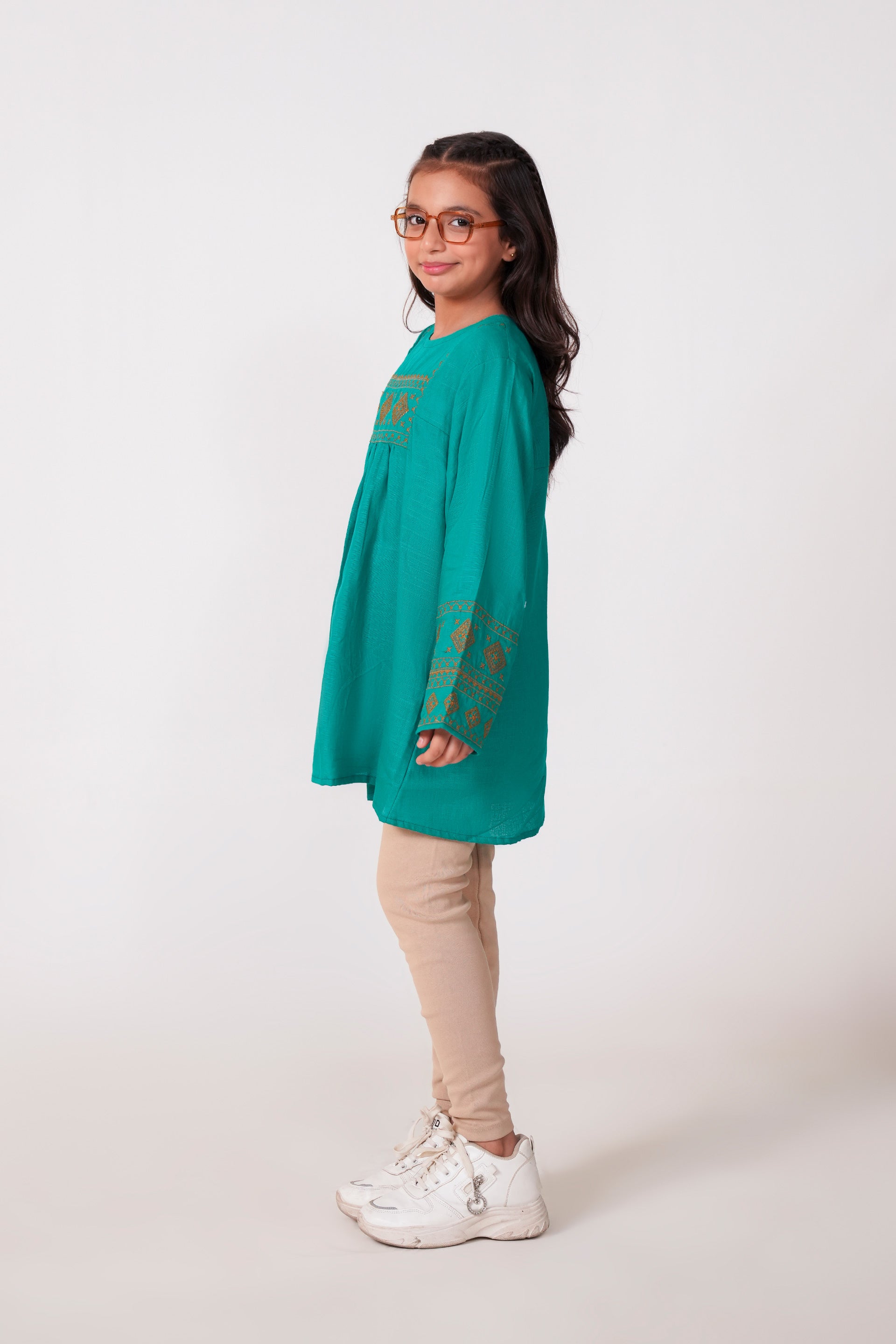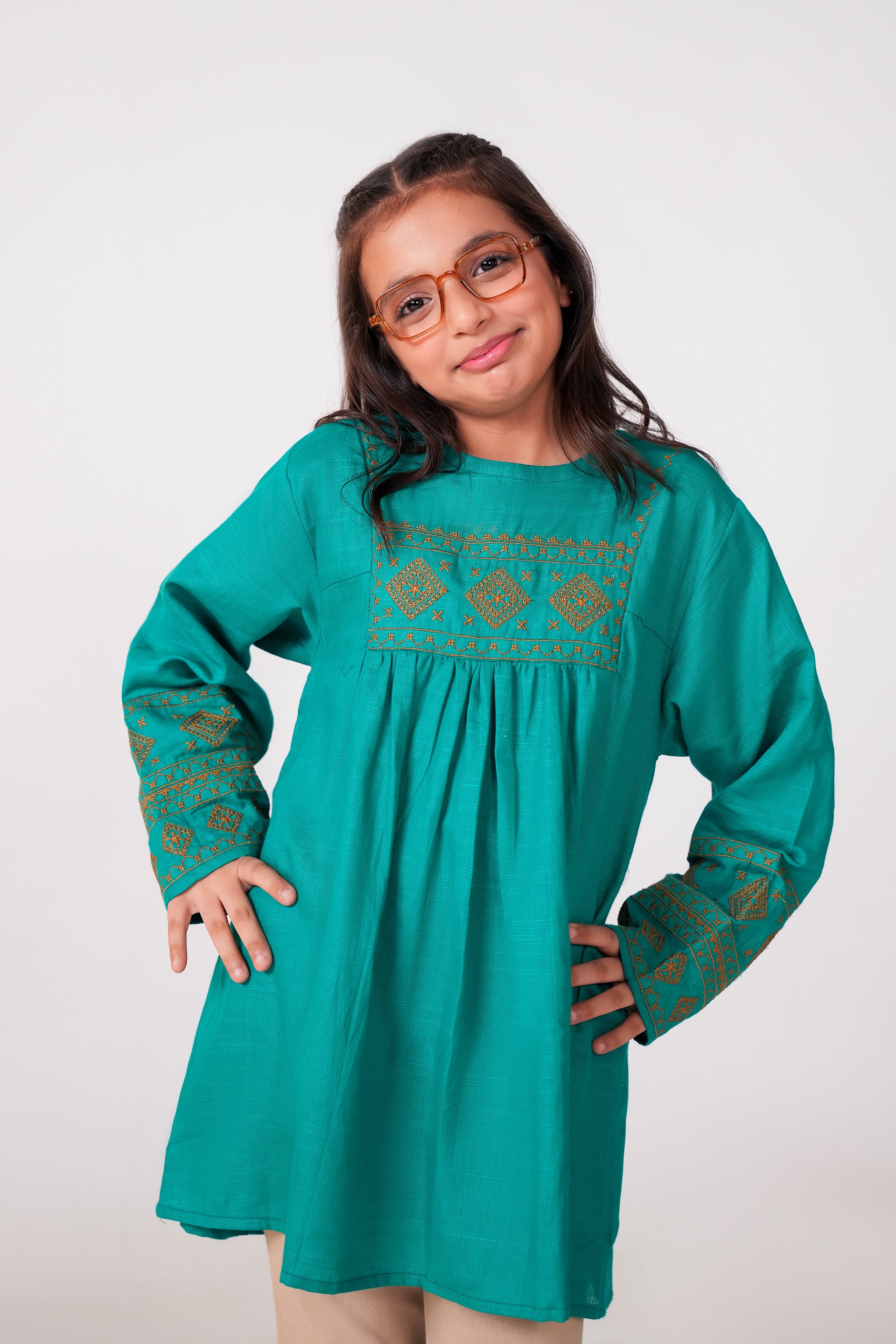 Elevate your little girl’s winter style with this teal green khaddar embroidered top, a perfect blend of comfort and elegance. Crafted from premium khaddar fabric, this top keeps your child warm while offering a soft and breathable feel — ideal for winter days and festive gatherings.