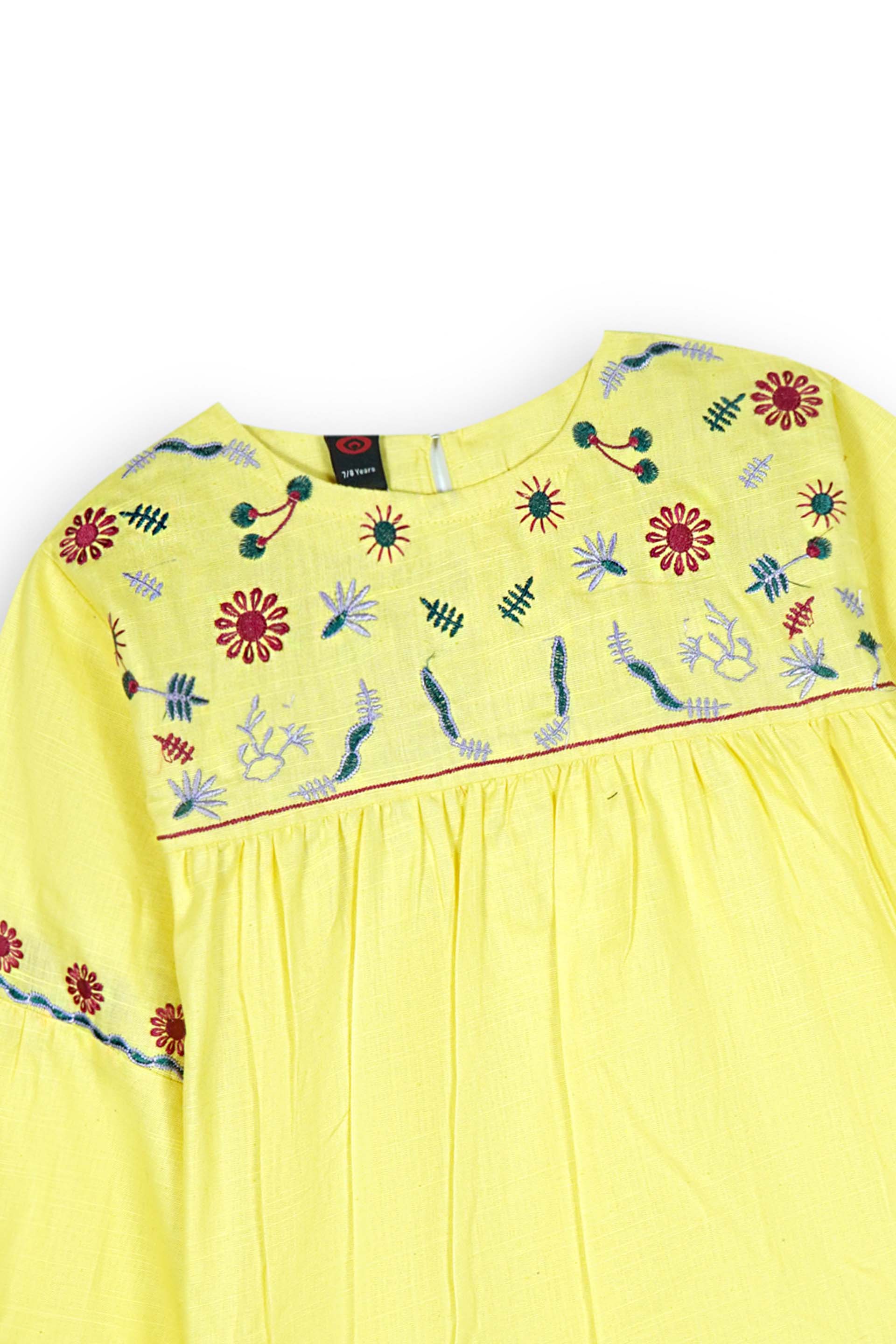 Keep your little one cozy and stylish this winter with our Yellow Embroidered Khaddar Top. Made from premium soft khaddar fabric, this top combines warmth with elegance. It features vibrant floral embroidery in shades of red, blue, and purple on the front yoke, sleeves, and hemline, giving it a cheerful, handcrafted look. The puffed sleeves with elastic cuffs add a playful touch, while the relaxed fit ensures maximum comfort all day long.