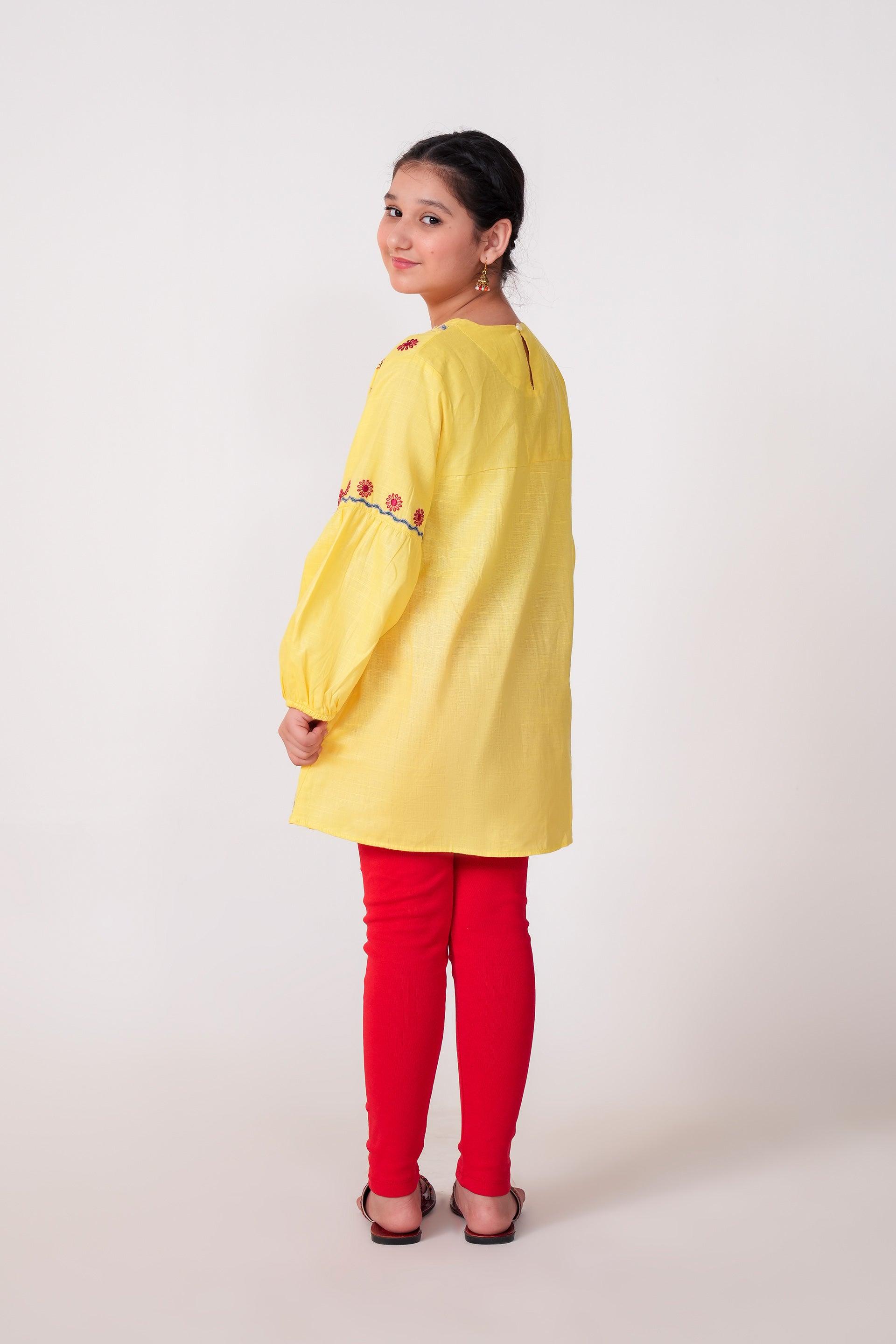 Keep your little one cozy and stylish this winter with our Yellow Embroidered Khaddar Top. Made from premium soft khaddar fabric, this top combines warmth with elegance. It features vibrant floral embroidery in shades of red, blue, and purple on the front yoke, sleeves, and hemline, giving it a cheerful, handcrafted look. The puffed sleeves with elastic cuffs add a playful touch, while the relaxed fit ensures maximum comfort all day long.